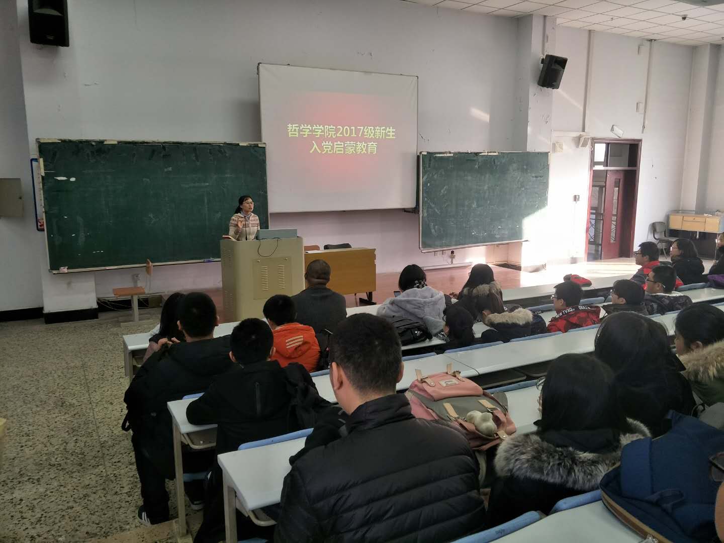 为了进一步做好学生理想信念教育,增强学生对党的基本知识的了解,引导学生不断端正入党动机,明确党员标准及入党程序,鼓励学生积极向党组织靠拢,2017年12月7日12时,哲学学院入党启蒙教育于汇文楼220室顺利举办。哲学学院党总支秘书黄影对2017级全体同学进行了入党启蒙教育。
