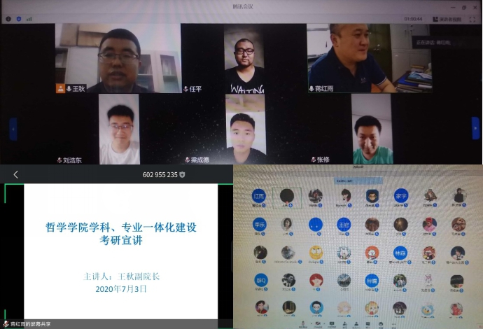 2020年7月3日下午,哲学学院召开了“学科、专业一体化建设暨考研宣讲”线上视频会议。在哲学学院党总支书记孙美晖指导下,辅导员孙庆斌老师的组织下,哲学专业2017级同学通过腾讯会议软件参加了此次会议。会议由哲学学院院长蒋红雨教授主持,副院长王秋副教授主讲。