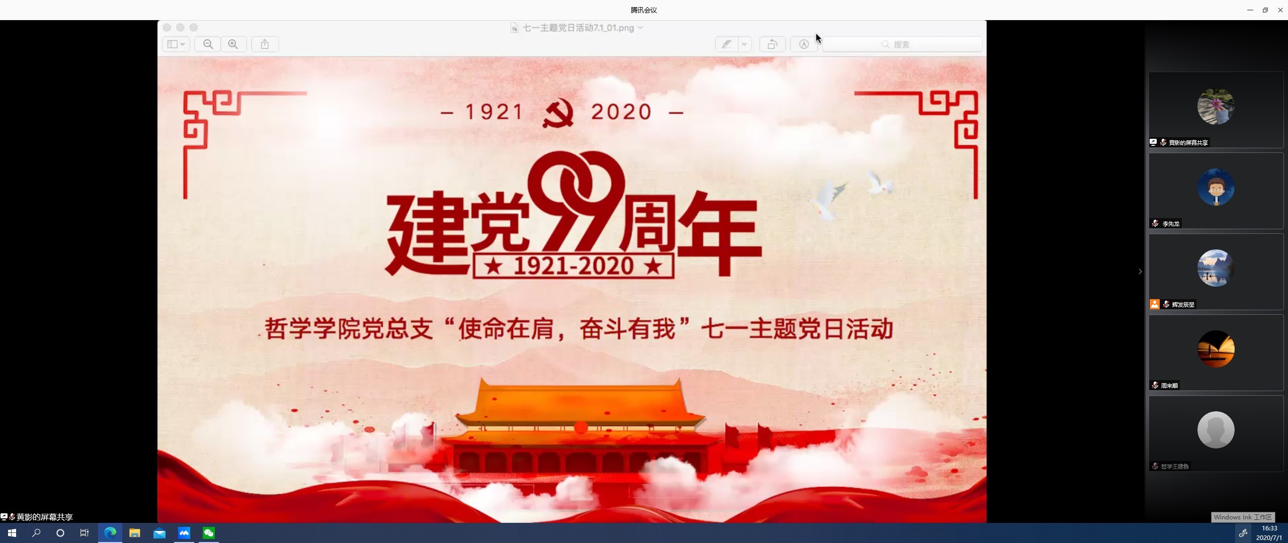 为庆祝建党99周年,结合5、6、7月份组织生活中心内容,进一步落实《在常态化疫情防控中开展加强基层党建“七个一”活动实施方案》,哲学学院党总支于7月1日15时30分组织召开了“使命在肩,奋斗有我”七一主题党日活动。