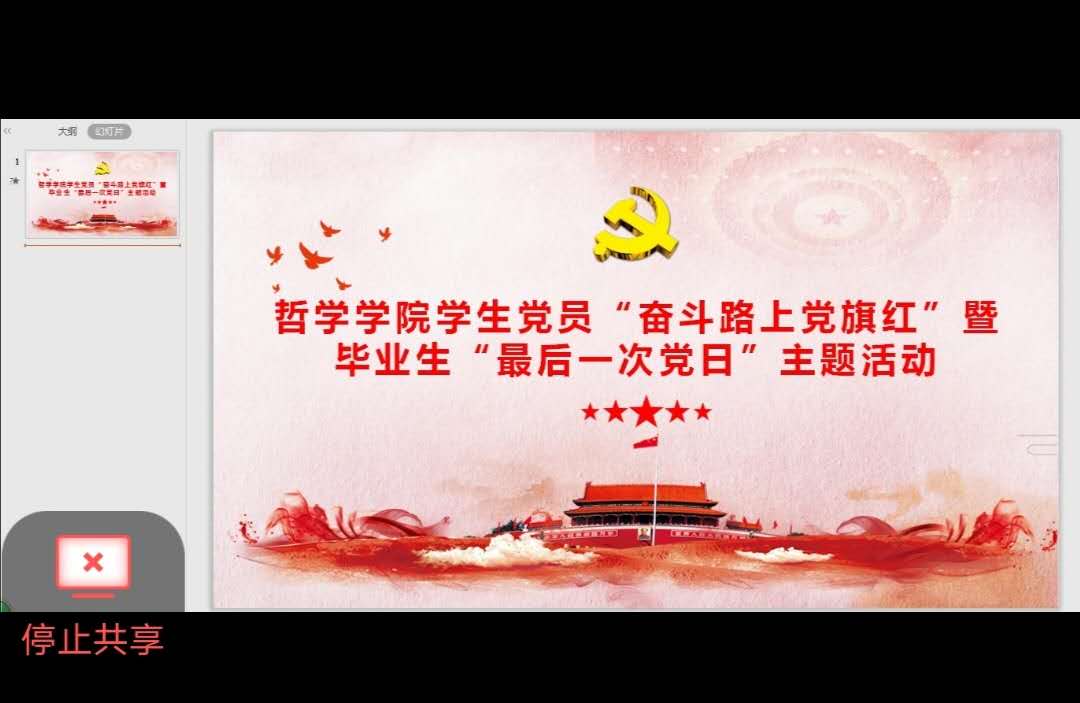 为庆祝中国共产党成立99周年,切实做到组织生活不断线,党员教育管理不放松,进一步做好毕业生党员、在校年级学生党员的思想引导工作。结合毕业生党员离校工作的实际和重点,在“七·一”党的生日来临前,哲学学院学生党支部于2020年6月30日19:30举办了毕业生党员“最后一次党日”暨“奋斗路上党旗红”庆七一主题活动。