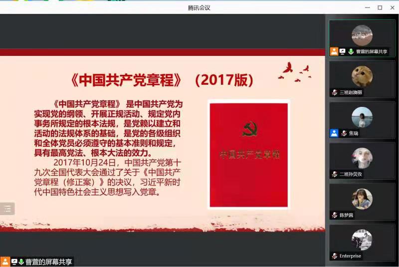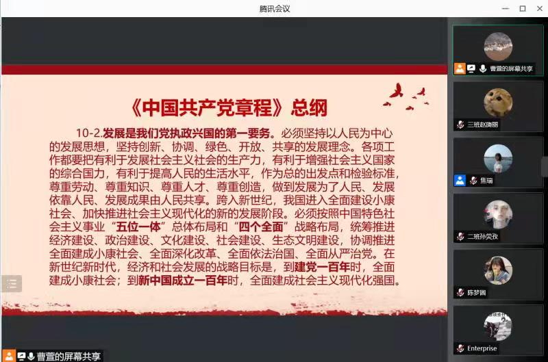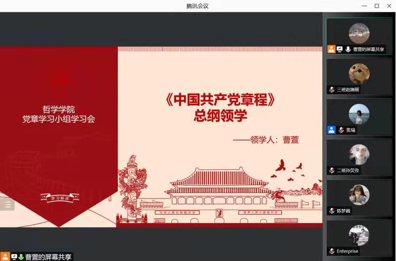 为引导学生自觉向党组织靠拢,端正入党动机,确立为共产主义事业奋斗终生的信念,有效引导学生提高党性修养,牢记党的宗旨,遵守党的纪律,学习党章总纲条文,增强学习党章的自觉性和坚定性,落实党的基本知识学习教育,2021年11月22号下午3时50分,哲学学院召开党章学习小组学习会。会议由焦瑞老师主持,党员班主任带领同学们学习,全体新生积极参加。