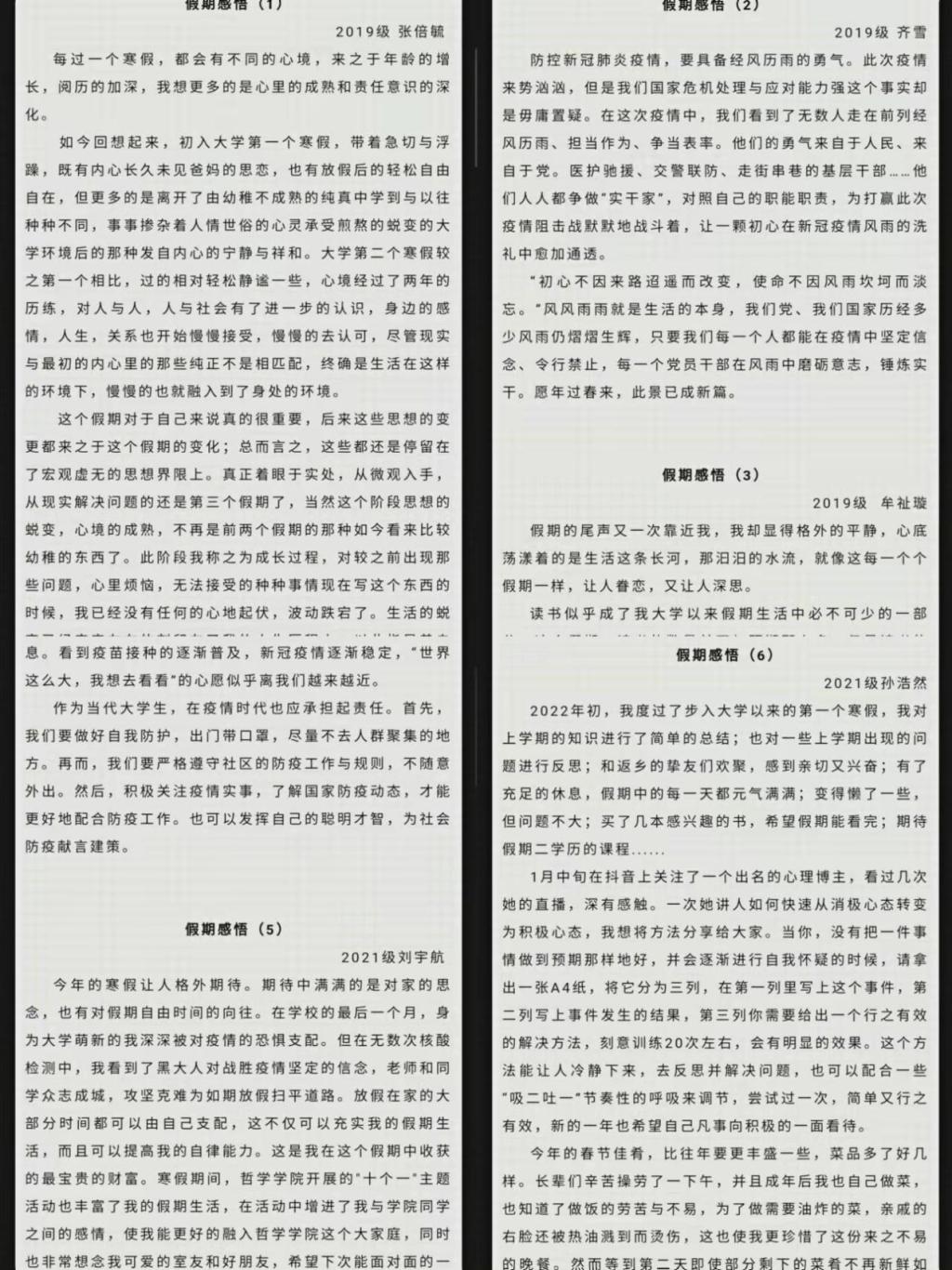 在刚刚过去的这个寒假,哲学学院面对学院全体同学举行打卡一篇假期感悟的活动,请同学们结合假期学习和生活经历,或结合抗击疫情过程中的感人故事,回味假期,总结收获,用文字记录个人成长,留住假期的美好记忆。
