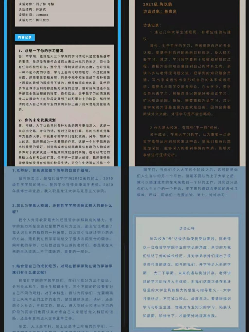 在这个寒假,哲学学院组织各位同学们寻找一位身边的黑大校友,可以是自己的长辈、亲属、老师、学长、学姐或者自己的朋友,与他们进行一次线上的“云”访谈,通过云端见面与他们进行深入交流,了解“过来人”的发展历程,听听他们的经验与建议,感受黑大人的温暖与柔情。