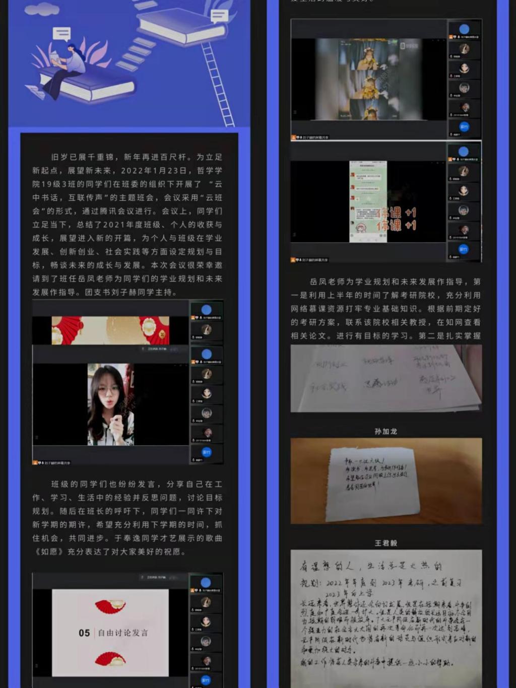 掌中引航,“云”中书话。寒假期间,哲学学院各班级通过腾讯会议举办“云班会”,总结班级、个人的收获与成长,并针对日后的学业发展、创新创业、社会实践等树立目标并作出规划,为学生的成长与发展引航。通过“云中书话,互联传声”的远程方式保持和加强了师生之间的专业互动,发挥线上实时互动的方式,跨越空间障碍,利用“云”技术,实现“云”沟通,助力班级、个人的共同进步与发展,以更好的姿态展望未来。