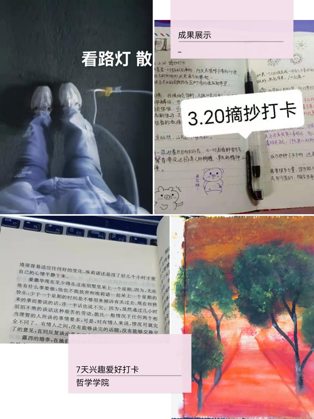 疫情管控期间,为了保证同学们的身心健康,响应快乐学习、劳逸结合的号召,哲学学院在2022年3月15日-3月21日进行了为期七天的兴趣爱好与体育运动打卡活动,该活动获得了同学们的广泛关注。