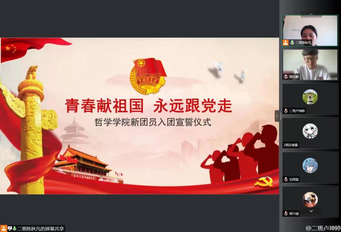为加强哲学学院共青团队伍建设,切实将先进青年吸收进团组织,保持团员队伍朝气蓬勃的青年特点,充分发挥共青团员先锋模范作用,以优异成绩喜迎党的二十大胜利召开,哲学学院于2022年6月9日下午线上召开新团员入团仪式。本次仪式由21级哲学二班团支书陈秋凡主持,哲学学院团委副书记焦瑞老师出席仪式,新团员及21级哲学二班全体同学参加仪式。