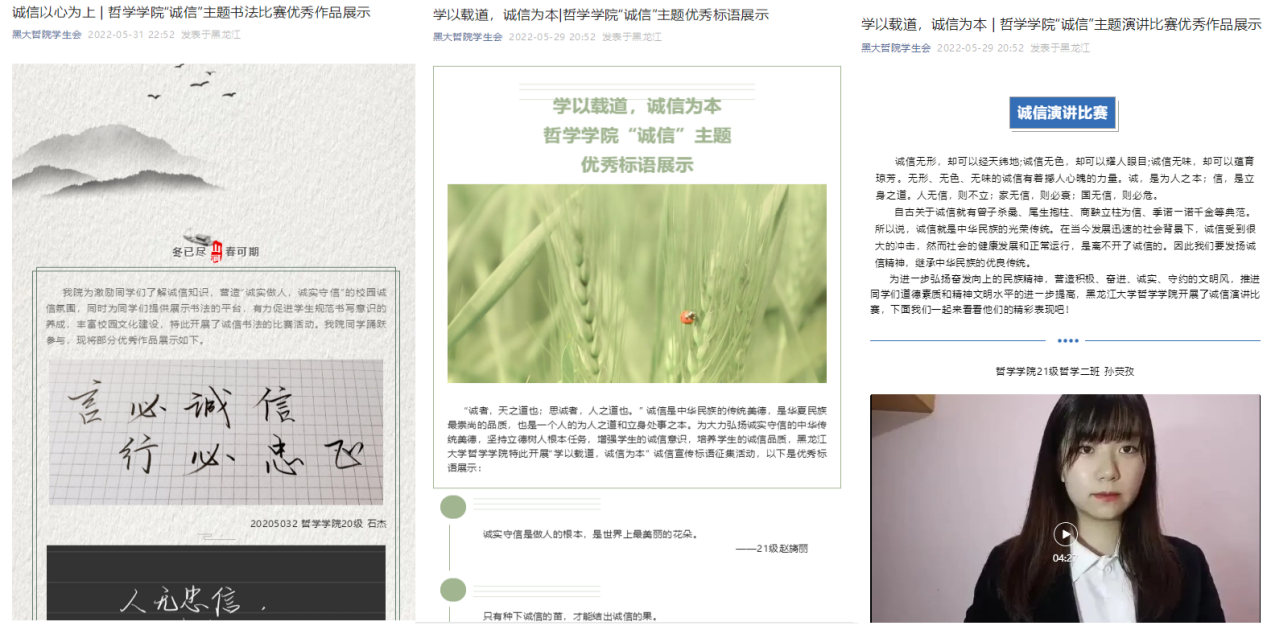 立诚心,书诚意,为增强学生的诚信意识,培养学生的诚信品质,丰富校园文化建设,自2022年5月23日到2022年5月27日期间,哲学学院组织开展了“诚信”主题书法评比活动、“诚信”主题演讲征集活动和“诚信”宣传标语征集活动,这些活动展现了学生的精神风貌,提高了学生的诚信意识,使学生的线上学习生活更加丰富多彩。讲诚信,共参与。2022年5月29日,哲学学院发布了优秀作品展示专题推送,展现了同学们对诚信精神的思考和理解。