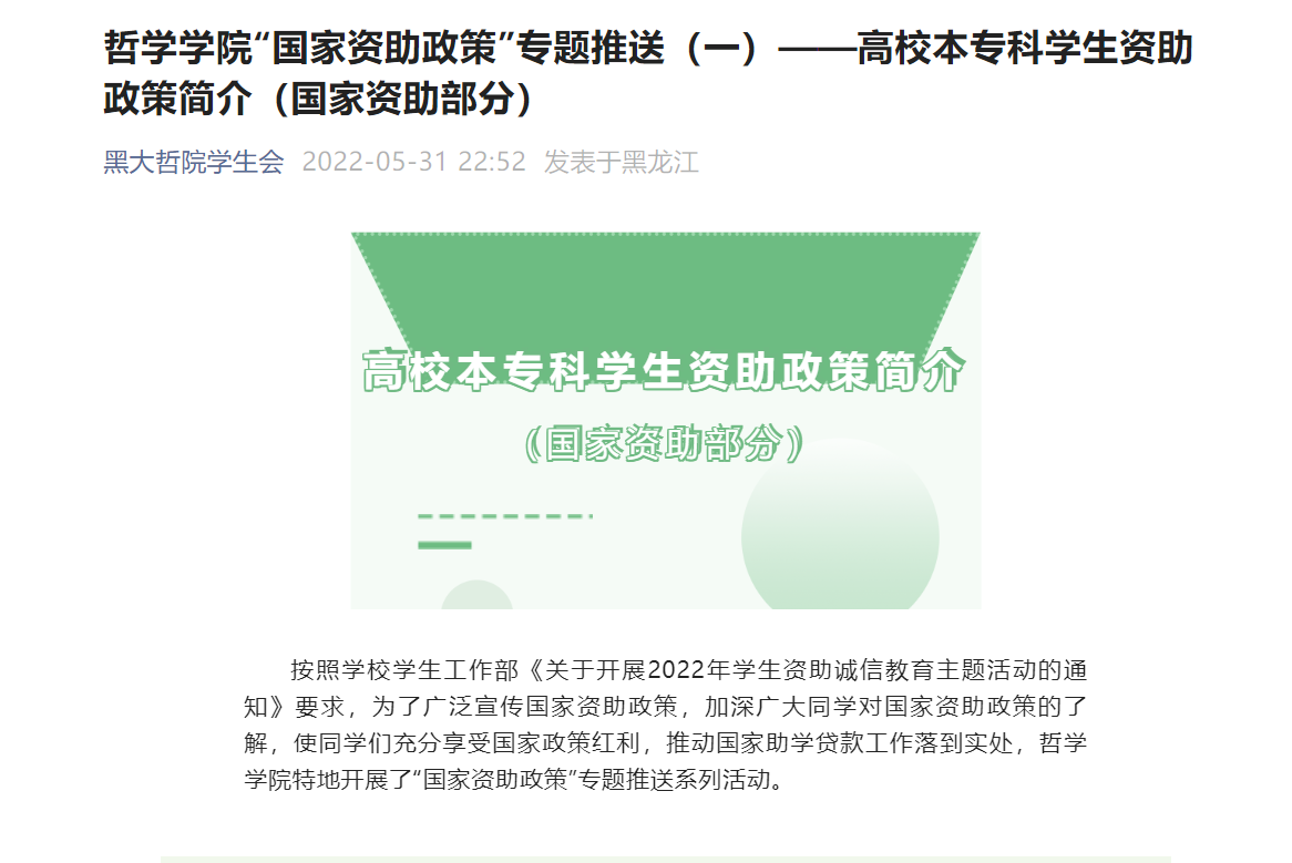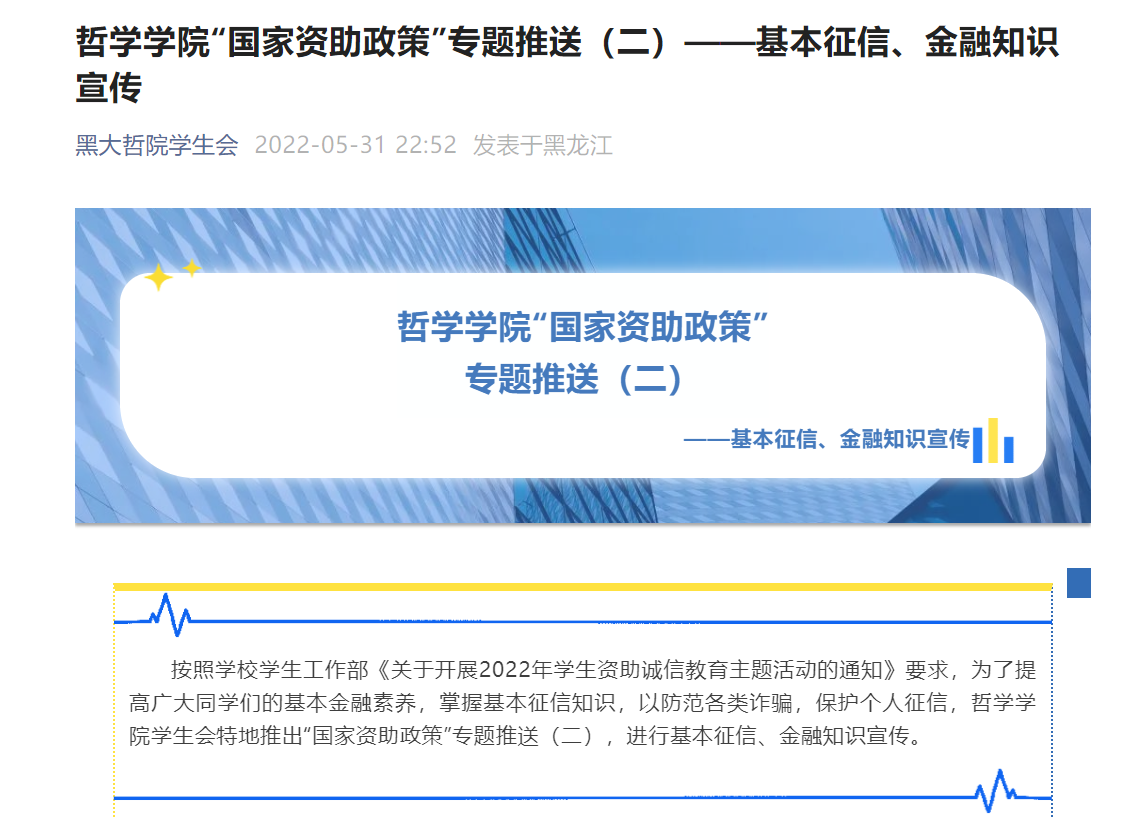 重视个人信用,享受政策红利。哲学学院还于2022年5月31日开展了征信金融知识“和”国家资助政策宣传专题推送,为同学进行个人征信和金融活动基本知识与国家相关资助政策内容介绍。