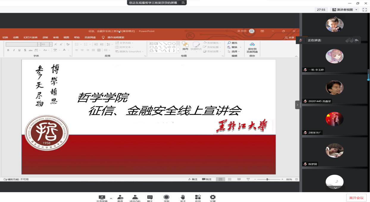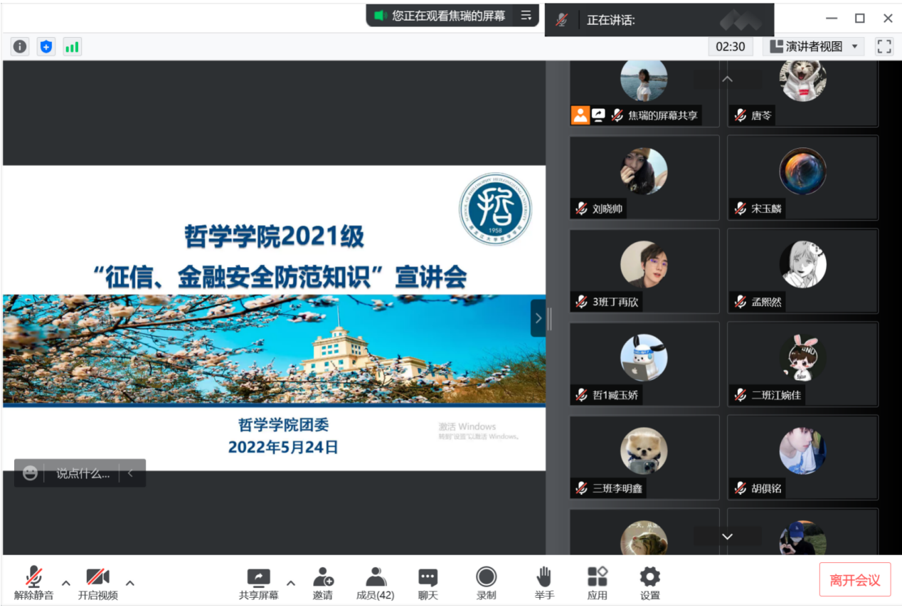 树立诚信意识,防范各类诈骗。2022年5月26日晚上7时,哲学学院为哲学学院21级学生举行了“征信、金融安全防范”线上宣讲会。宣讲会由哲学学院学生会秘书处干事吴莎莎主持,由杨安怡、刘芳菲和张学广三位同学负责讲解使同学们对征信金融安全防范知识有了基本的了解,提高了同学们的征信意识、金融安全防范意识。