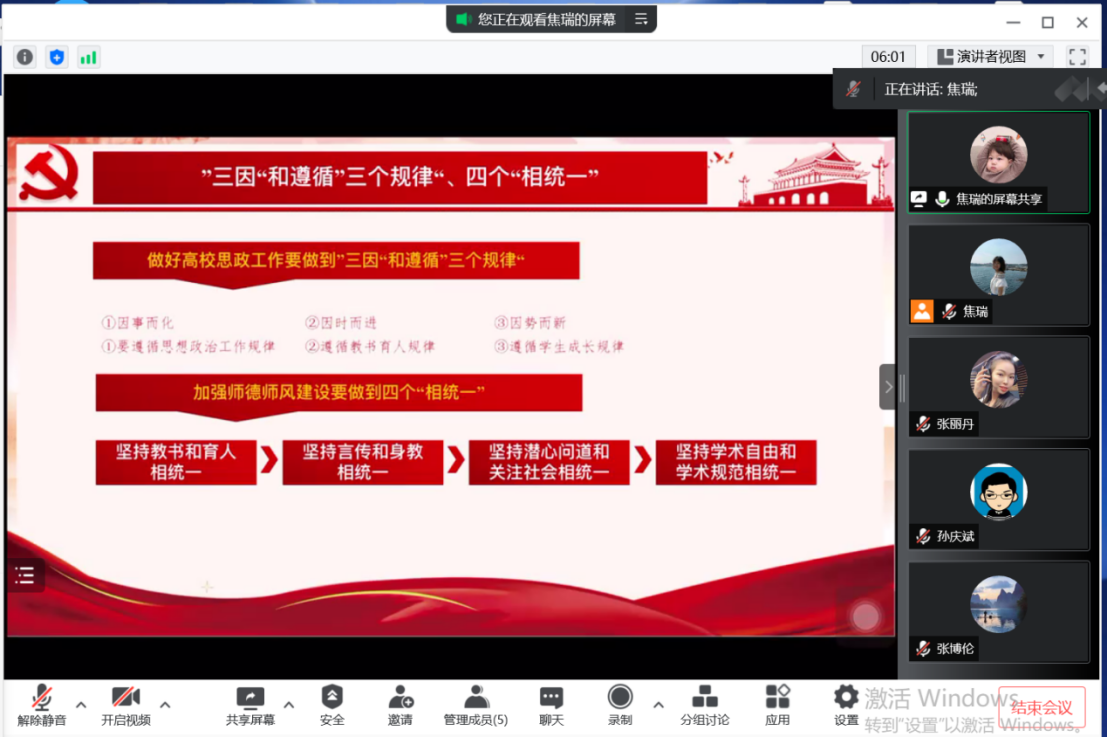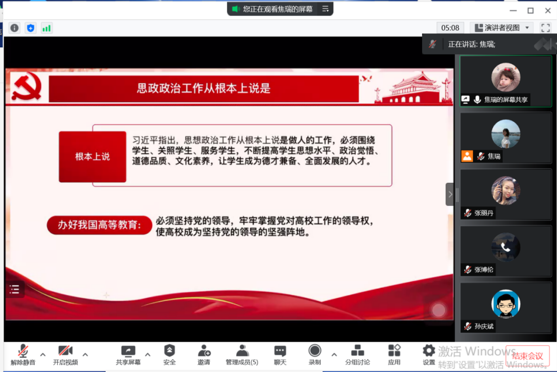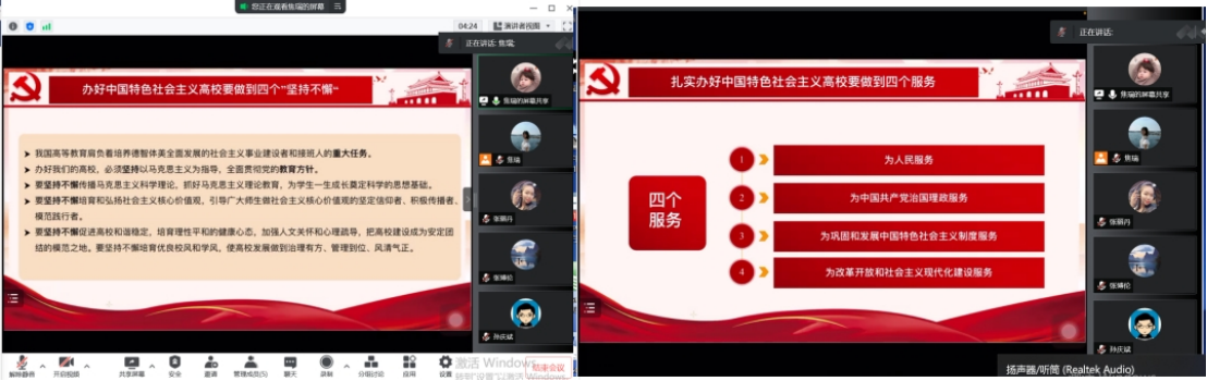 通过学习老师们受益匪浅,纷纷发表讲话。学院党总支副书记张丽丹老师指出,习总书记的讲话具有很强的政治性、思想性和针对性,是指导做好新形势下学校思想政治工作的纲领性文献,从坚定信仰到树立信心,从感染学生到赢得学生,习近平总书记为我们上了一堂特殊而难忘的思政课,我们将牢记党中央的嘱托,努力培养担当民族复兴大任的时代新人,培养德智体美劳全面发展的社会主义建设者和接班人。19级辅导员孙庆斌老师指出,辅导员是思想政治教育工作者的重要组成部分,必须在完成日常工作的基础上,提高政治站位,勇挑工作重担,牢记习总书记嘱托,不忘初心、危中寻机,在疫情反复延宕的背景下,推进思想政治工作,完成为党育人为国育才的使命。20级辅导员张博伦老师表示,要认真学习全国高校思想政治工作会议精神,旗帜鲜明讲政治,深入贯彻习近平新时代中国特色社会主义思想,提高政治站位,坚持从讲政治的高度,紧紧地围绕立德树人的根本任务,为培养中国特色社会主义事业合格建设者和可靠接班人贡献力量。21级辅导员焦瑞老师表示,作为辅导员,要肩负立德树人使命,加强政治站位,做到“三因”和遵循“三个规律”,同时,引导学生做到“四个认识”,为培养德智体美全面发展的社会主义接班人贡献力量。