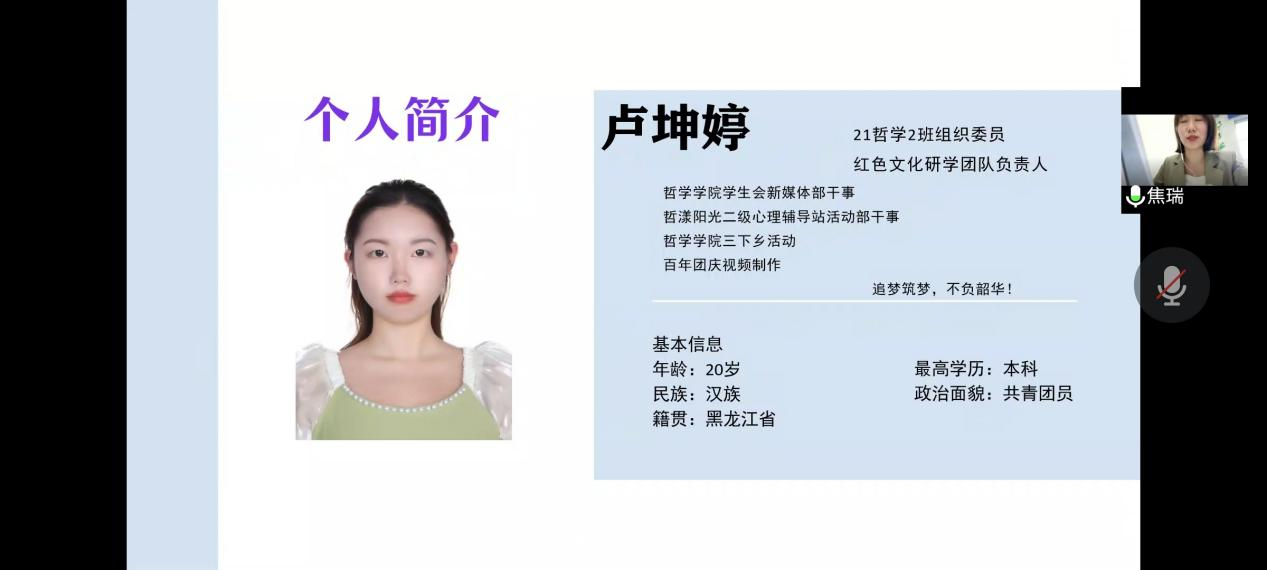 首先,2022级哲学一班的新生班主任盖毓鑫同学进行自我介绍,盖毓鑫同学希望可以和同学们携手共进、乘风破浪、共同进步。如果同学们在学业上或是生活上有困难,也会尽己所能帮助大家。