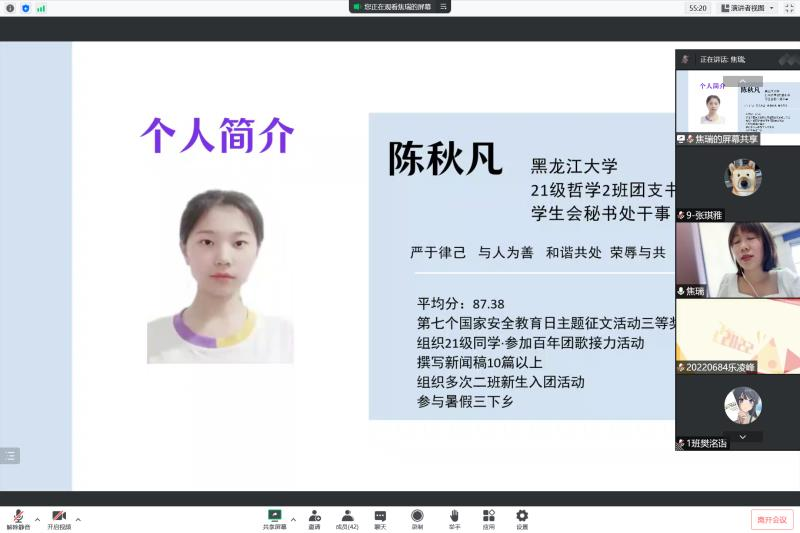 会议伊始,焦瑞老师通过一段视频进行了简单的自我介绍,焦老师强调自己做事的宗旨:在什么阶段、在什么岗位,都要做好自己本职的事。焦老师表示她正是因为对学生的热爱才坚定地选择了辅导员这个职业,她也希望通过对自己求学经历,用自己的所学所感来帮助各位新生在未来的四年里,少走弯路,共同成长。希望各位同学在四年后回望自己的大学生活时没有遗憾。接下来各位学生班主任和2022级新生依次进行自我介绍。