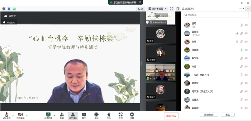 三尺讲台写春秋,一片丹心育桃李。在第38个教师节暨中秋节即将来临之际,为弘扬尊师重教的传统美德,表达对教育工作者的诚挚敬意与谢意。2022年9月7日,哲学学院通过腾讯会议线上开展了“心血育桃李 辛勤扶栋梁”教师节主题活动,哲学学院全体教职工共同欢度佳节。党总支书记孙美晖主持活动。