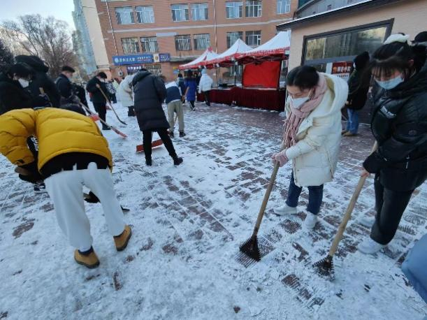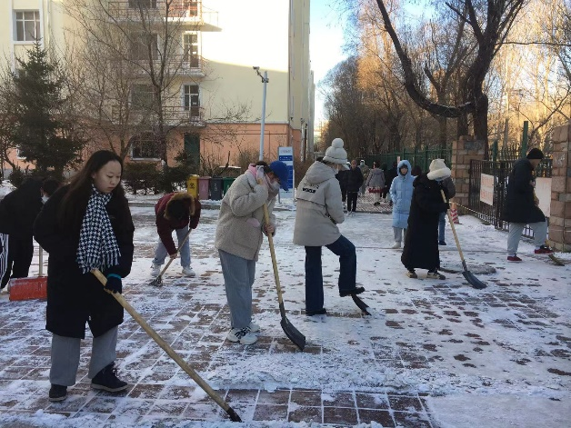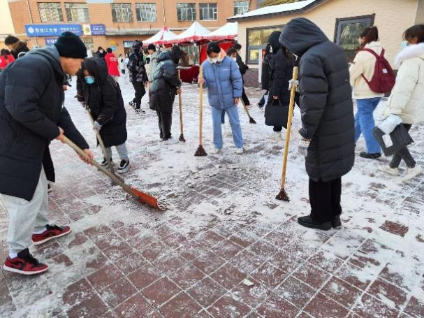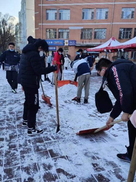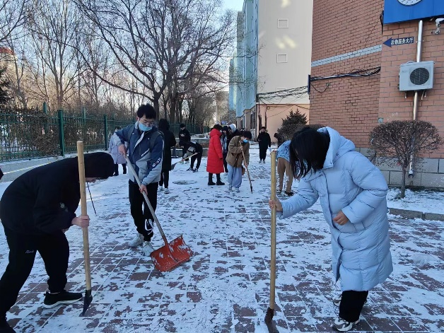 同学们众人一心,焦老师给同学们做了分工任务后,每个同学都拿好手中的工具,向着地上的雪发起冲击,虽然此时气温很低,还时刻伴有寒风吹过,但是同学们没有丝毫退缩,全都认真的对待自己的任务,最终让原本盖了一层雪的道路显现出了原本的色彩,干净的道路再度出现在黑大师生的眼中。