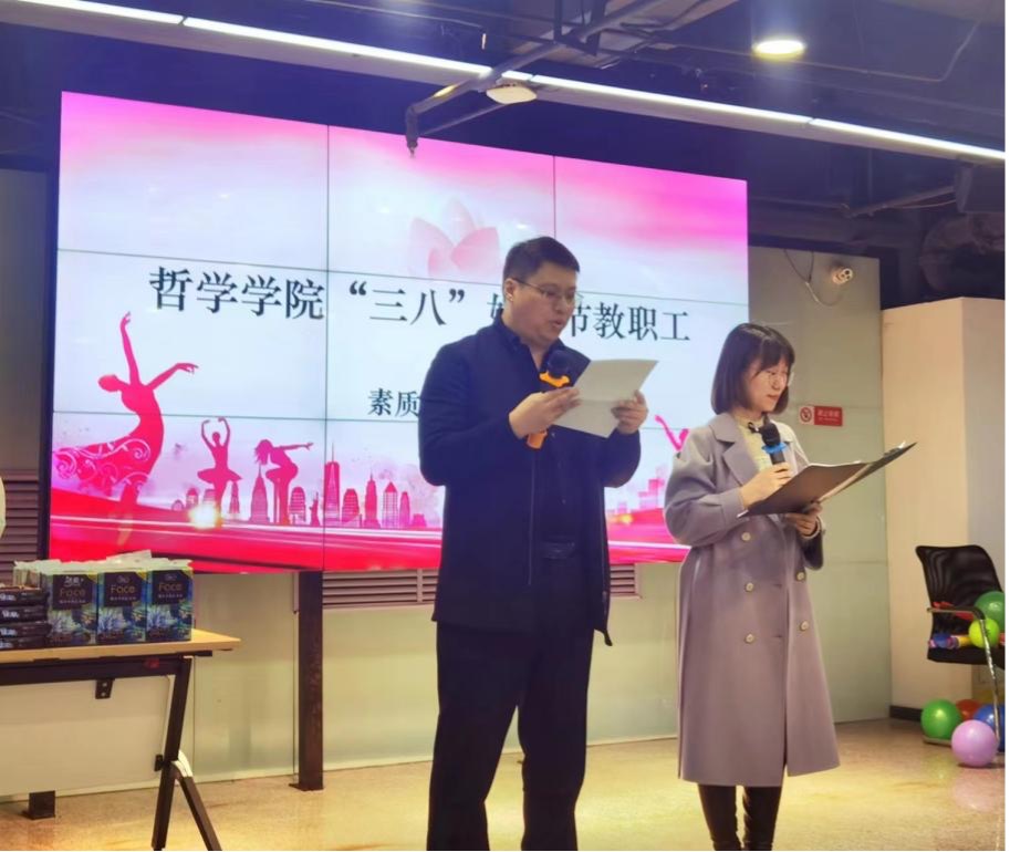 春风阵阵,万物新生,伴随着春天的脚步,我们迎来了第113个国际劳动妇女节,在这个春风送暖的日子里哲学学院全体教职工队伍欢聚一堂,共同庆祝这个难忘的节日,2023年3月8日,哲学学院于汇文楼开展“笔耕不辍,桃李万疆”三八妇女节庆祝活动。学院党总支书记孙美晖、院长蒋红雨、副院长周来顺、党总支副书记张丽丹和全体教职工出席活动,哲学学院工会主席武嵩昊、2021和2022级辅导员焦瑞主持活动。