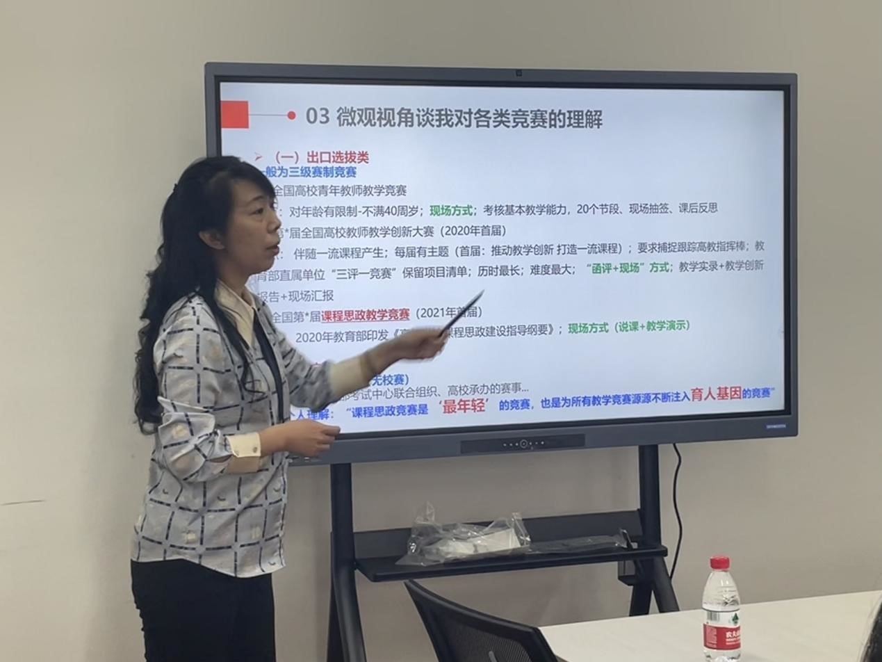 王老师以自己的工科课程设计为例,详细地分享了她和她的团队是如何在课程顶层设计和理念层面进行思考和操作的,从找学情痛点,确立思政目标再到深挖课程内生资源与教学文件的更新,王老师全景再现式的向在座的老师和同学们展现了她在课程思政建设中的具体工作脉络。尤其强调教师的科研工作和教学工作应该是统一的,不冲突的,体现在专业建设上,课程是专业建设的最小单元,也是教师教学能力的直接体现,具有承上启下”的重要作用。关于竞赛,王老师着重介绍了她了解到的主流的竞赛项目,并指出“课程思政竞赛是‘最年轻的竞赛’,也是为所有教学竞赛源源不断注入育人基因的竞赛”,引导青年教师积极投身相关赛道,为新时代铸魂育人作出自己的贡献。