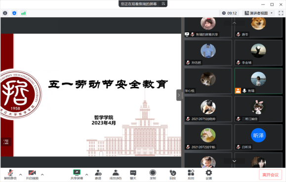 为加强安全教育工作,确保学生们的五一出行安全,以保证学生们能够更好地学习、生活和工作,哲学学院于4月23日下午分年级开展五一劳动节安全教育及规范离校要求会议,2022级全体同学于汇文楼357开展会议,2021级全体同学于线上开展本次会议,2021级、2022级辅导员焦瑞老师主持会议。
