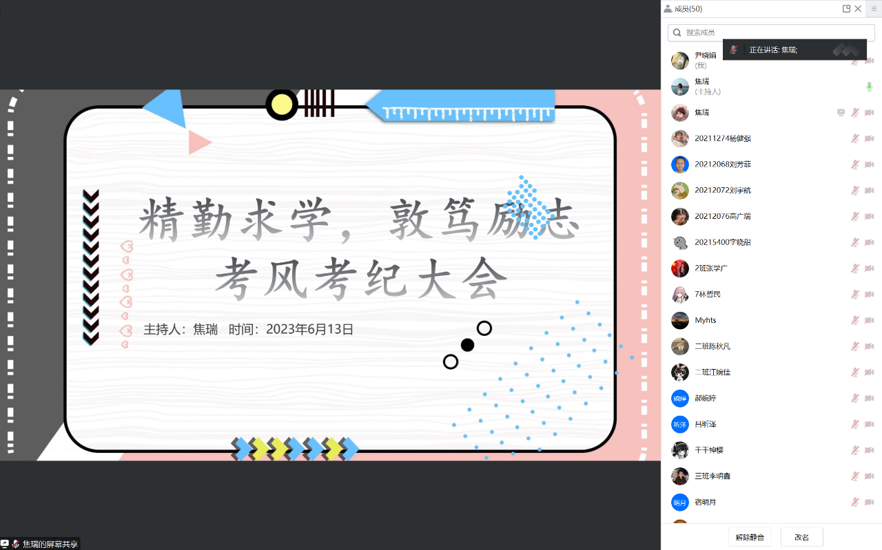 强化诚信意识,严肃考风考纪。为加强学风建设,营造良好的学习氛围,公平工作的考试环境,6月13日—14日,哲学学院分年级、分层次召开了以“精勤求学,敦笃励志”为主题的考风考纪暨学生诚信教育大会,会议以线上线下相结合的方式召开,学院辅导员张博伦、焦瑞老师主持会议,各年级学生参加大会。