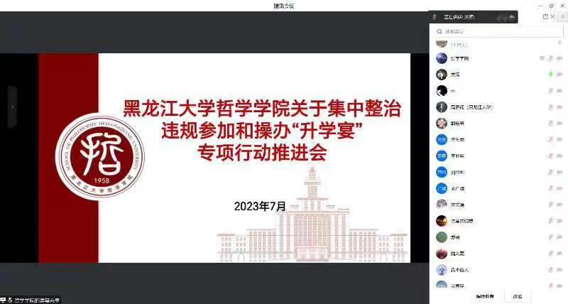 为加强习近平新时代中国特色社会主义思想主题教育,贯彻“工作落实年”相关要求,严肃党风政风、师德师风,自觉抵制不良风气,树立人民教师廉洁从教的良好形象。7月18日19时,根据省纪委及省教育厅相关文件精神,结合我校《关于在全校开展集中整治违规参加和操办“升学宴”专项行动的通知》具体要求,哲学学院于线上召开集中整治违规参加和操办“升学宴”工作推进会,会议由哲学学院党总支书记孙美晖主持并传达文件精神,哲学学院全体教师参加会议。