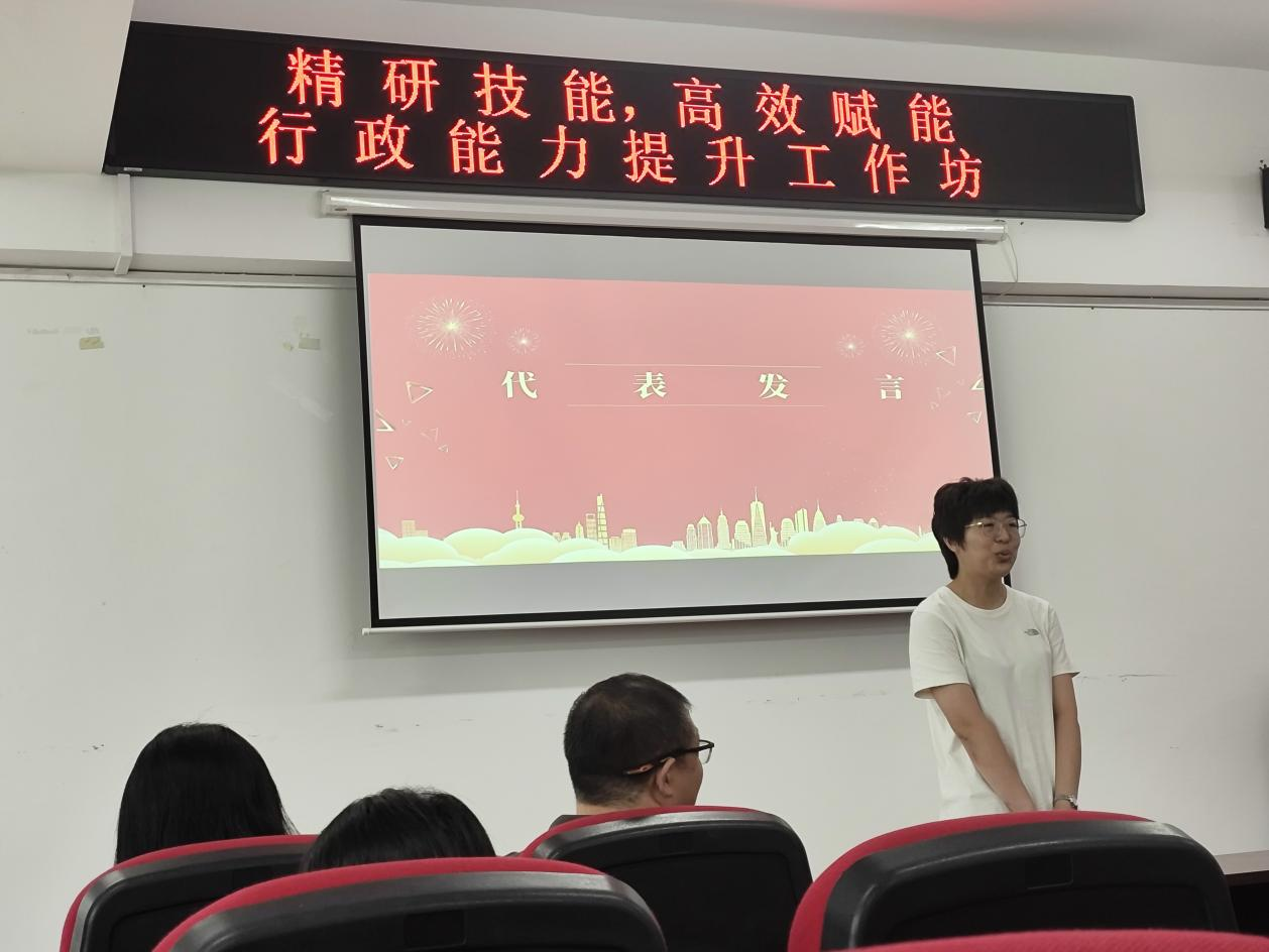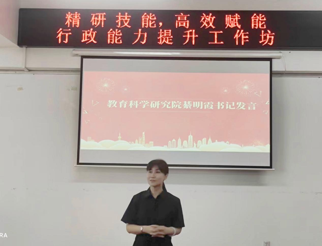 教育科学研究院党总支书记綦明霞为工作坊闭幕式致辞,表示此次联合工作坊内容丰富,通过名师引领和交流研讨,让行政人员突破传统思维的束缚,探索出更具效率的工作流程,相信将有力推动日后工作的高质量发展。(哲学学院、政府管理学院、新闻传播学院、教育科学研究院供稿)