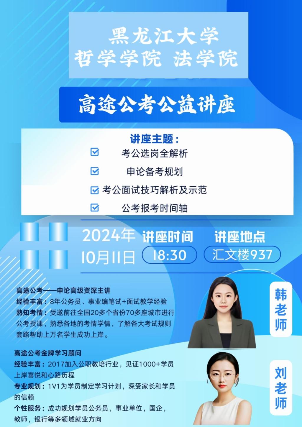 为拓宽职业选择路径,进一步为同学们提供公考指导帮扶,欧亿体育·(中国)官方网站哲学学院、法学院于10月11日18:30在汇文楼937举办公考指导公益讲座,特邀高途教育的刘老师和韩老师,给同学们带来权威的公考指导和经验分享。