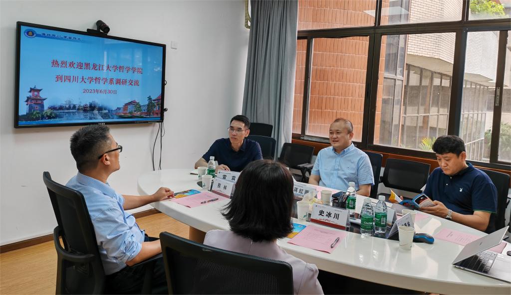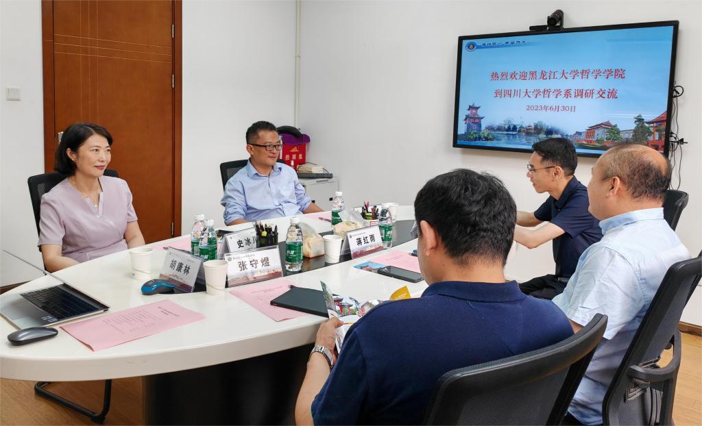 6月30日,哲学学院院长蒋红雨,伦理学教研室主任、硕士研究生导师组组长雷震,教务办主任张守煜赴四川大学哲学系进行学科与专业建设调研。四川大学哲学系与宗教所党总支书记史冰川、系主任熊林、党政办主任胡康林出席座谈会。