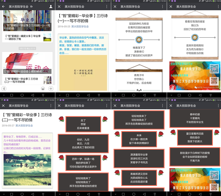 为了丰富同学们的课余生活,同时进一步创新毕业季活动形式,2016年5月21日,哲学学院“青春不散”三行诗征集活动正式启动,截至6月1日,活动共征集三行诗作品六十余份,其中较为优秀的二十份作品已在学院微信公众平台进行了展示。