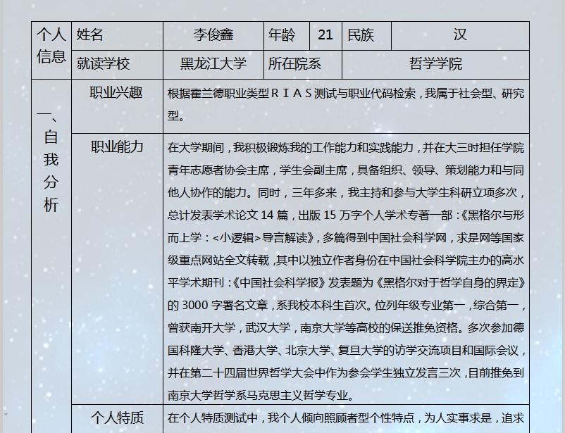 本次大赛以“规划学业·体验职场·成就梦想”为主题。活动初期,哲学学院举行了职业生涯规划大赛动员大会,辅导员张博伦老师出席了会议,并在会议上向同学们介绍了职业生涯规划大赛的主题与意义,希望同学们踊跃报名,积极参与,通过比赛更加明确自己的学业规划与职业发展。经过初期的活动动员与赛前培训,同学们对比赛有了初步认识,产生了浓厚的兴趣与足够的重视,并踊跃上交作品。 2018年11月21日,哲学学院学生职业生涯规划大赛预选赛于汇文楼937室顺利举行,同学们分别进行了简历、规划书与VCR展示。最终,来自不同年级的四名同学脱颖而出,成功晋级接下来的校级复赛。