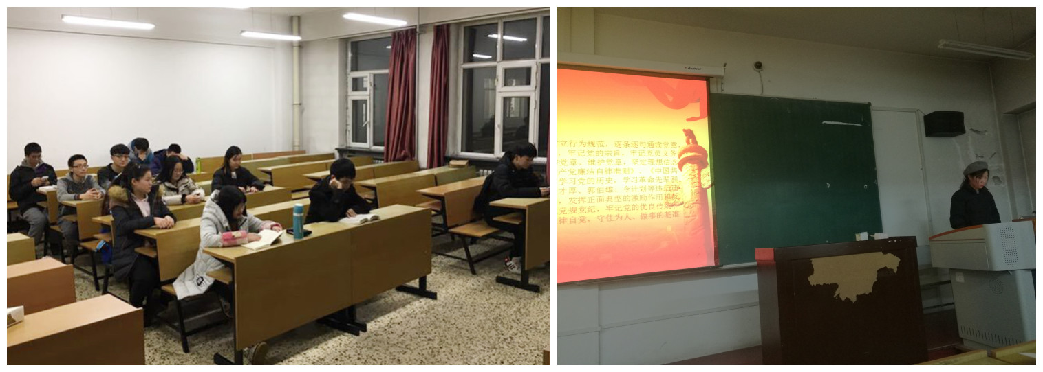 田燃同学首先从学习党章党规矩的重要性从手,谈到学生党员不仅要逐条逐句通读党章,认真学习党内法规,更要学习党的历史,学习革命先辈和先进典型,从优秀共产党员身上学习党的优秀传统作风,树立崇高道德追求,加强纪律自觉。接下来,她结合习近平总书记系列重要讲话精神,谈了她对个人梦与中国梦、民族梦关系的理解。作为未来社会主义事业的接班人,在现阶段的学习与实践中,要不断地发挥主观能动性,提高自身的工作能力和业务水平,努力实现个人梦,敢于为中国梦、民族梦的实现努力拼搏。党课最后,田燃同学从一名学生党员的角度出发,谈到学生党员要着眼党和国家事业的新发展对党员的新要求,着眼加强理论武装、统一思想行动,坚持以知促行,做讲政治、有信念,讲规矩、有纪律,讲道德、有品行,讲奉献、有作为的合格党员。