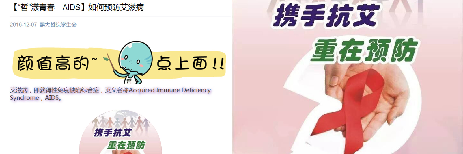 首先,哲学学院学生会在微信、微博等官方公众平台上进行了内容推送,对艾滋病的相关知识进行了宣传。在这期间,同学们了解到每天有超过7000人新发感染艾滋病,全世界各地区均有流行。专家估计,艾滋病全球流行重灾区可能会从非洲移向亚洲。据中国疾病预防控制中心估计,我国存活HIV携带者及艾滋病患者约78万人,全年新发感染者4.8万人,死亡2.8万人。主要传播途径有血液传播、性传播和母婴传播等,这些内容推送使同学们对艾滋病有了进一步的了解。与此同时,哲学学院学生会还在学院的生活意见栏中发布了关于艾滋病防治的小贴士,让同学们了解到如何避免与HIV感染者,艾滋病病人及高危人群发生性接触,避免不必要的静脉注射,拒绝毒品,增强自我保护意识等艾滋病的预防知识,提高了同学们的防范意识。