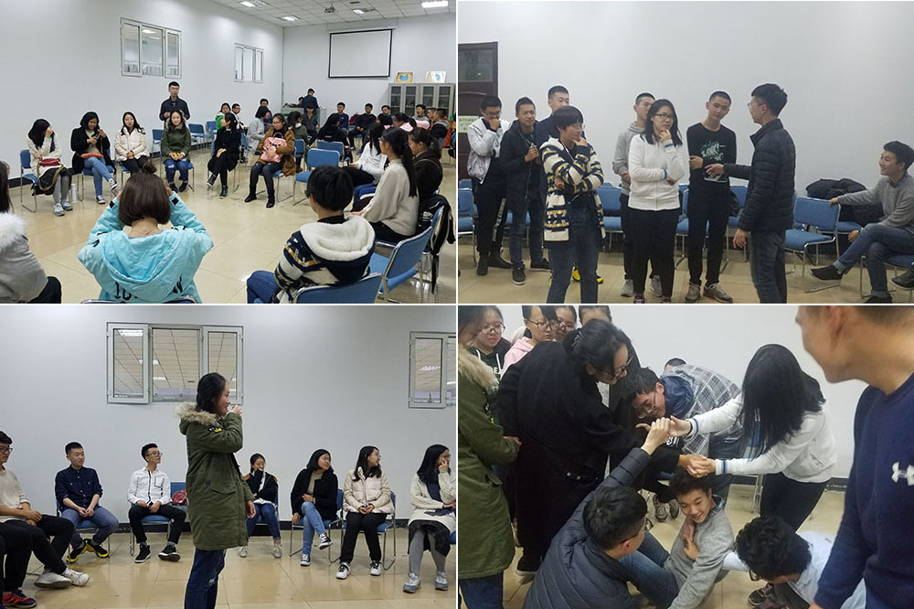 活动伊始,张博伦老师进行了开场发言,说明了此次活动的流程与意义。本次活动共分三个内容。一是做“大风吹”游戏。这一环节主要考验同学们的默契程度,同学们随着口令与相邻同学交换座位,刚开始同学们之间配合欠佳,总是出现问题,随着游戏的进行,默契不断增长,同学们也取得了良好的成绩。第二项活动是无声排队,同学们手拉手排成一队,然后被打乱位置重新连成圈,需要将打结的部分解开,由于同学们之间尚欠磨合,这项游戏最后并没有成功。紧接着是学生发言,同学们对游戏失败的原因进行了总结。虽然游戏失败了,但在解结的过程中,同学们之间的感情更深厚了。最后一项活动是设计名片,同学们要设计自己的个性名片,在名片上画上自己的特点,爱好。然后向同学们展示。每位同学通过自己设计的名片进行发言,向别人全方位地介绍自己。通过这个环节,同学们对彼此有了更深入的了解。本次团体活动在大家的欢声笑语中接近尾声,老师做了总结发言,最后大家合影留念。