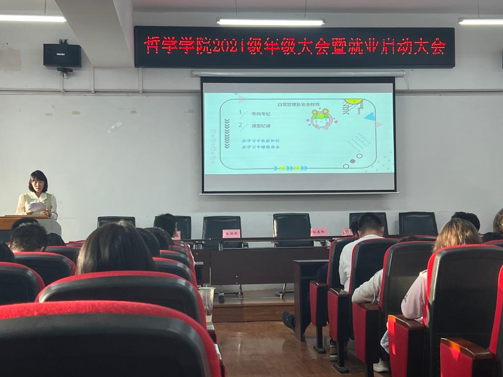 为扎实做好新学期新生教育管理工作,贯彻落实“关于开展23年秋季学期开学第一课系列教育活动的的通知”,引导2021级学生进一步明确目标方向,做好大学规划,端正态度,提振信心。哲学学院于2023年9月13日15时在汇文楼937召开秋季学期年级大会暨就业启动大会。哲学学院党总支书记孙美晖、党总支副书记张丽丹、正处级辅导员孙庆斌、2021级辅导员焦瑞出席会议,2021级全体同学参加本次会议,会议由焦瑞老师主持。