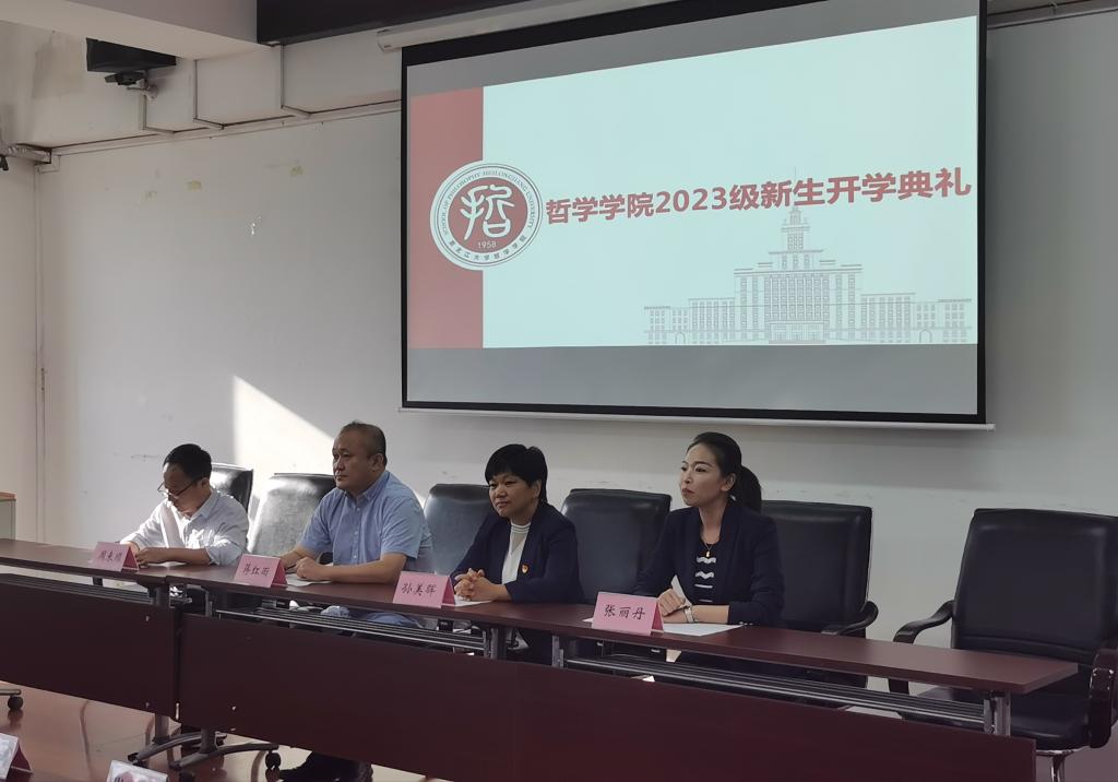 为进一步做好2023级新生入学教育,强化新生爱校荣校意识,哲学学院于2023年9月12日下午在汇文楼937会议室举办2023级新生开学典礼,哲学学院党总支书记孙美晖、院长蒋红雨、党总支副书记张丽丹、副院长周来顺、2023级辅导员孙庆斌、科技哲学教研室主任林菲、新生班级导师张凯、潘麒羽以及2023级全体新生出席本次会议,大会由学院党总支副书记张丽丹主持。