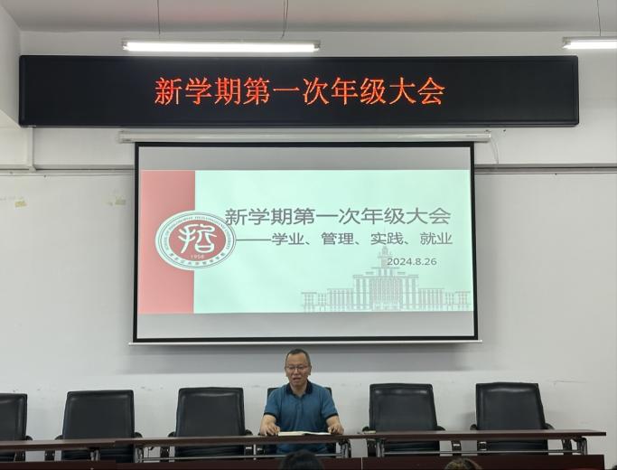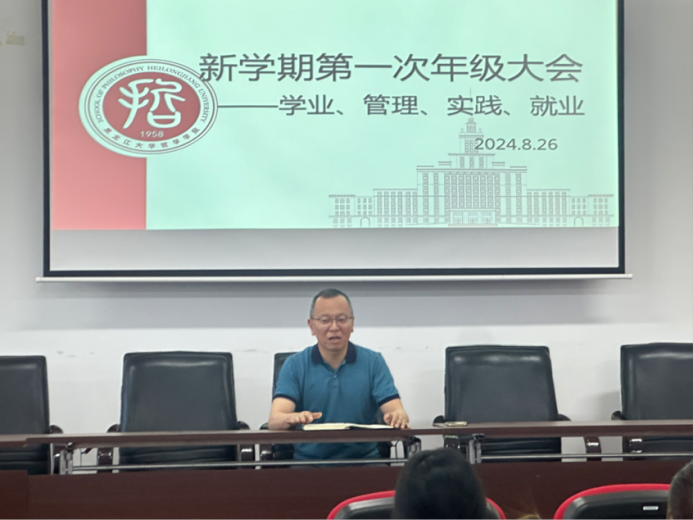 新学期,新气象。为进一步推动学生德智体美劳全方面发展,做好新学期规划,迎接新学期的到来。2024年8月26日,哲学学院在汇文楼937召开新学期第一次年级大会。会议由2023级本科生正处级辅导员孙庆斌老师主讲,2023级全体本科生参加。
