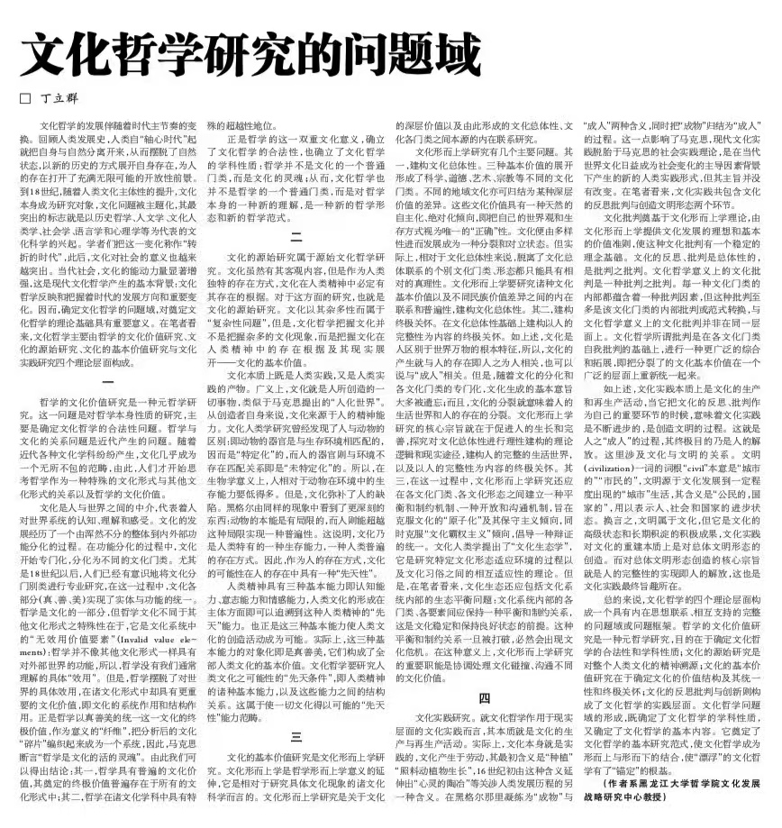 近日,哲学学院丁立群教授在《光明日报》(2025年3月17日15版)发表了题为《文化哲学研究的问题域》的学术文章,深入探讨了文化哲学的理论框架及其时代意义。该文章不仅探讨了文化哲学边界问题,而且就新时期如何深入文化哲学研究提供了新思路。