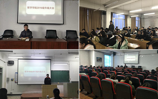新学期,新气象,新征程,新篇章,为了明确新学期要求,引导学生尽快调整状态适应新学期的学习生活,哲学学院于2018年3月8日-13日分别召开年级大会。哲学学院团委书记、辅导员黄影老师,团委副书记、辅导员张博伦老师出席各年级大会,学院全体同学参加了会议。