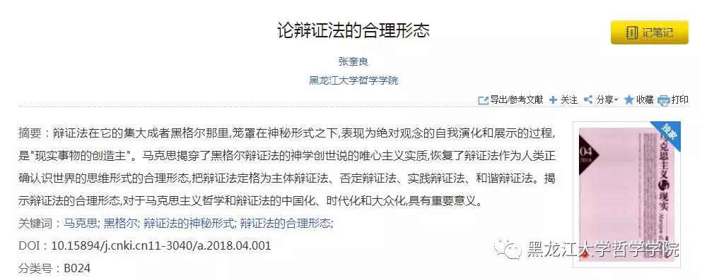 2018年,欧亿体育·(中国)官方网站哲学学院张奎良教授的《论辩证法的合理形态》一文被《新华文摘》2018年第19期全文转载,并被封面推荐,该文原载于《马克思主义与现实》2018年第4期。