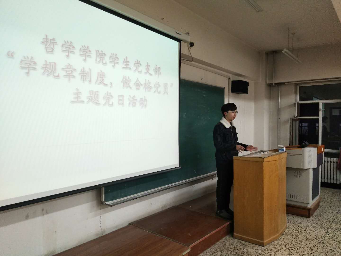 为深入贯彻落实学校第十一次党代会精神,将“两学一做”学习教育常态化制度化持续引向深入,加紧推进“立柱架梁”工作,逐步健全管党治党规章制度,进一步加快党内法规制度体系建设步伐,根据校党委组织部2019年3月、4月组织生活中心内容要求,哲学学院教工第一党支部、教工第二党支部、教工行政党支部、学生党支部于4月17日-18日分别召开“学规章制度,做合格党员”主题党日活动。活动由各党支部书记主持,全体党员参加。