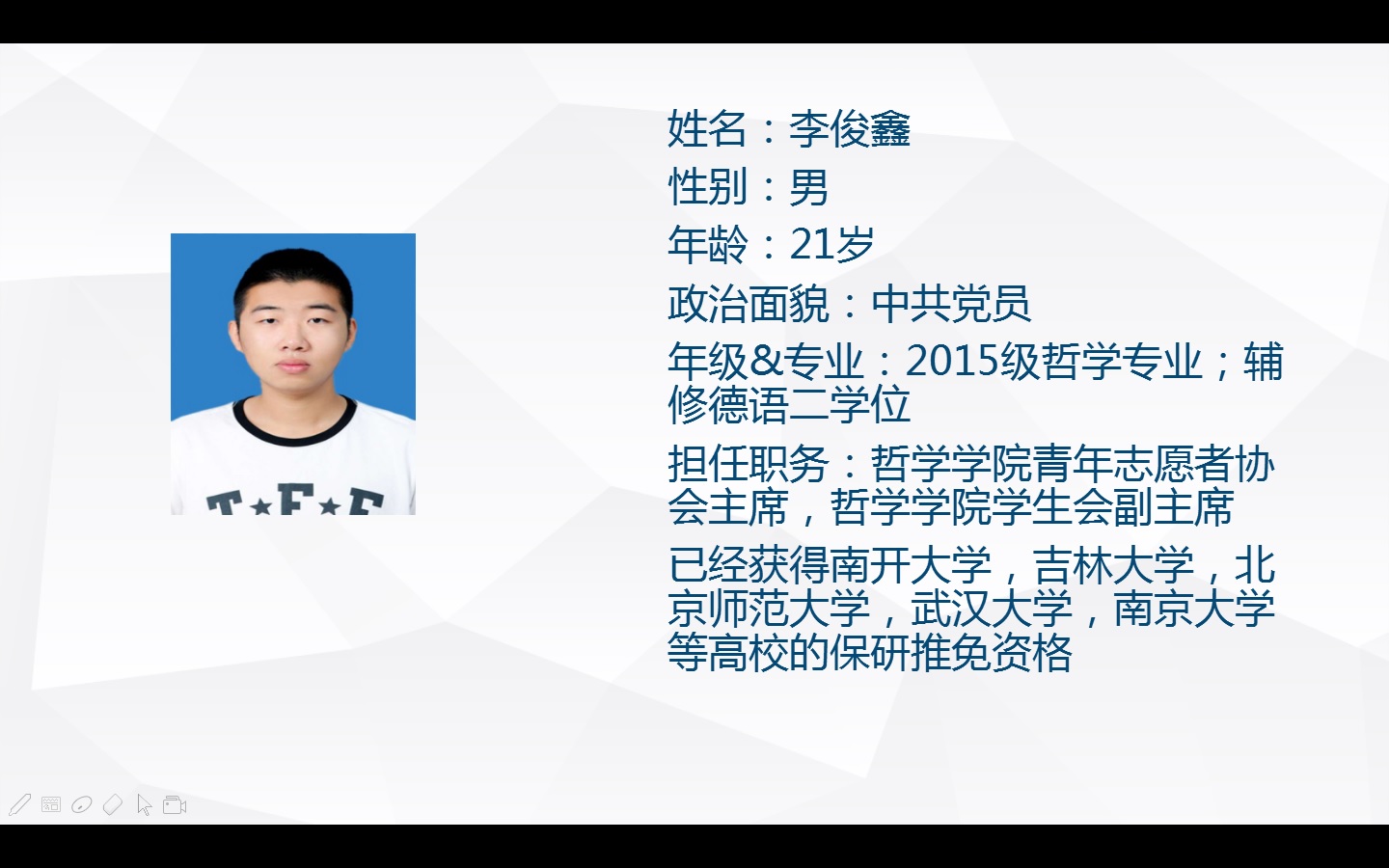 本次经验分享会分为两个部分,第一部分是保研经验分享,由李俊鑫等优秀同学进行经验分享。在这一部分中,几位同学主要介绍了目前同学十分关心的保研的相关政策、如何申请夏令营等问题。