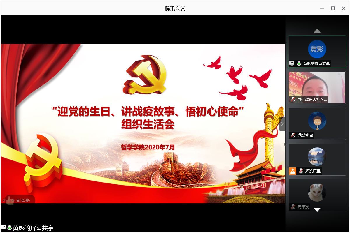 根据《关于在常态化疫情防控中开展加强基层党建“七个一”活动实施方案》安排,哲学学院党总支于2020年7月15日面向全体师生党员召开了线上“讲战疫故事、悟初心使命”组织生活会。