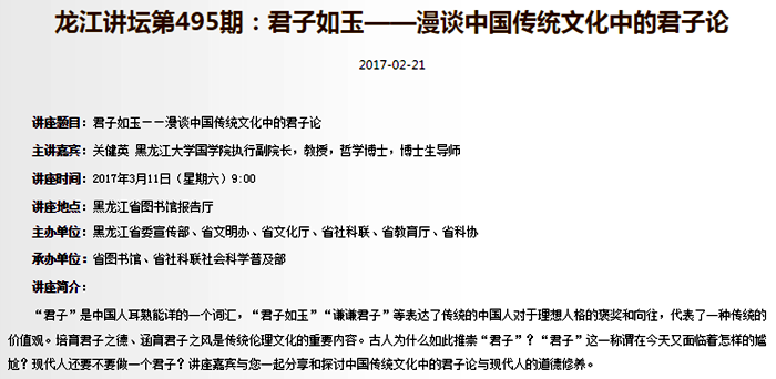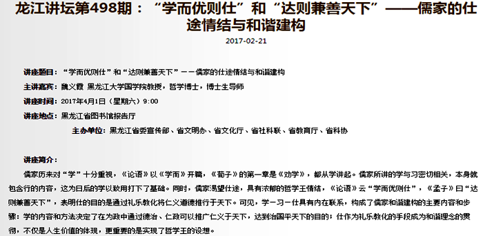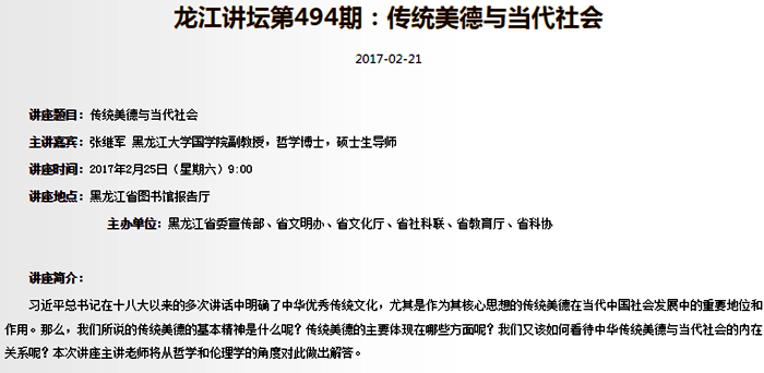 “十三五”期间,哲学学科注重发挥高校教材在文化传承中引领作用,张锡勤教授和丁立群教授作为第一首席专家主编并出版“马工程”重点教材《中国伦理思想史》、《当代西方哲学思潮评析》;以国学学会为载体,整合优秀国学资源,通过“龙江讲坛”中华优秀传统文化系列讲座,省广播电台“古训今用”系列讲座,高校国学教育等活动形式,弘扬中华优秀传统文化。以哲学学院为挂靠单位,成立国家级学会“当代文化哲学研究会”,推动了国内文化哲学、马克思主义哲学领域的学术繁荣。