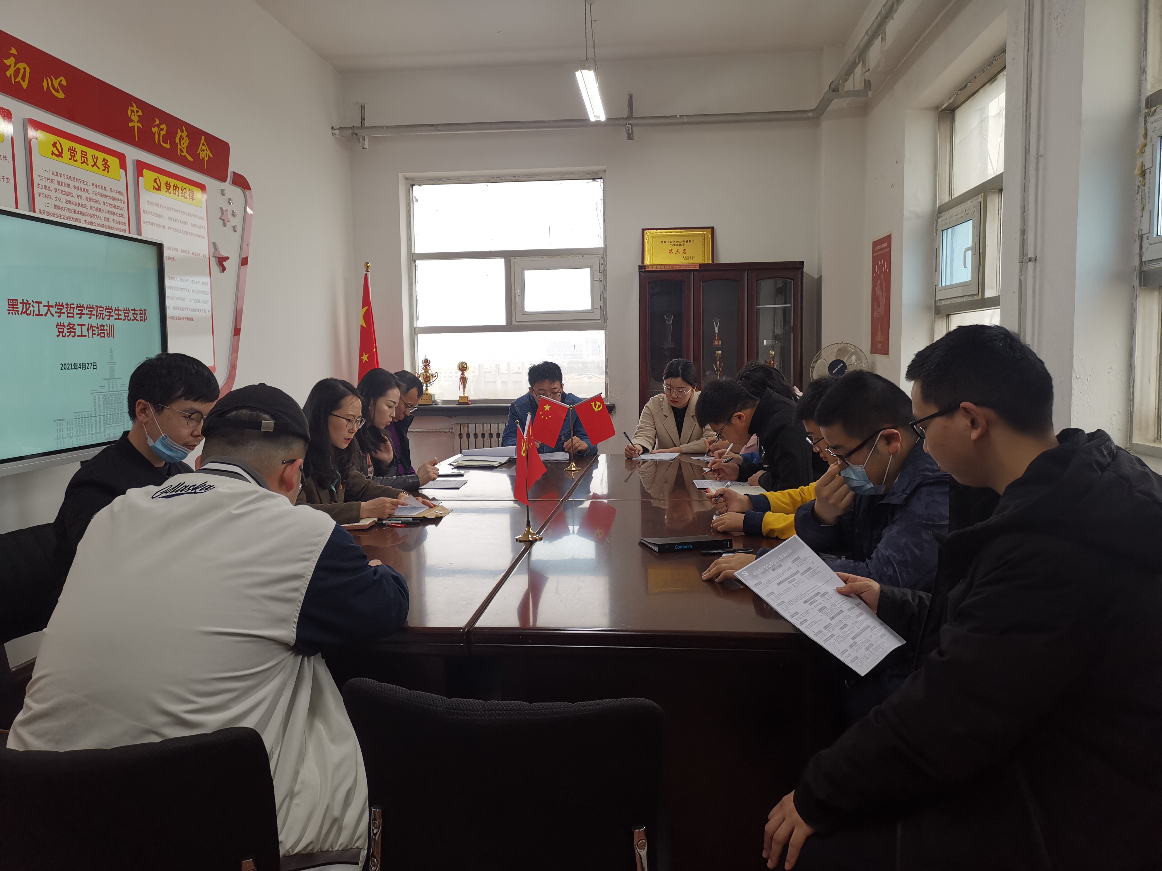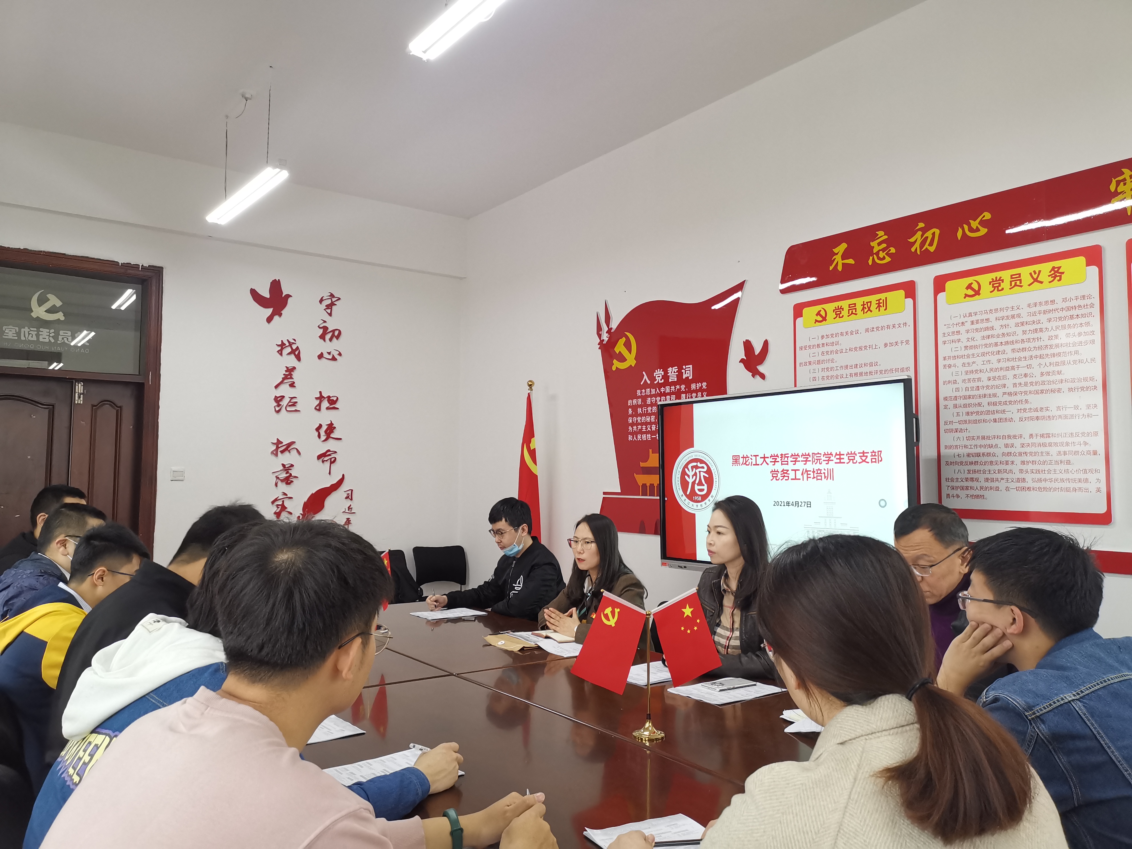 2021年4月27日10时,哲学学院在汇文楼916室开展学生党支部党务工作培训。会议由学院党务秘书黄影主持,学院党总支副书记张丽丹、正处级辅导员孙庆斌、团委书记张博伦以及各学生党支部委员集体参加。