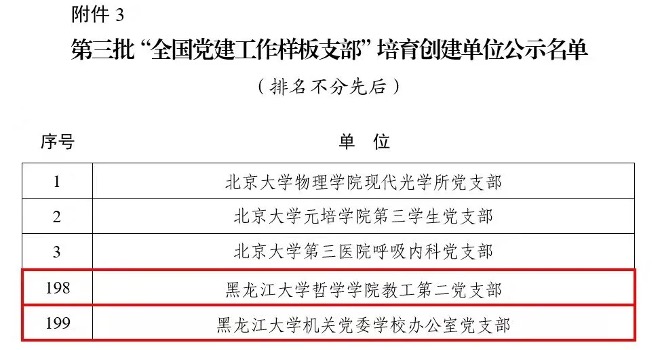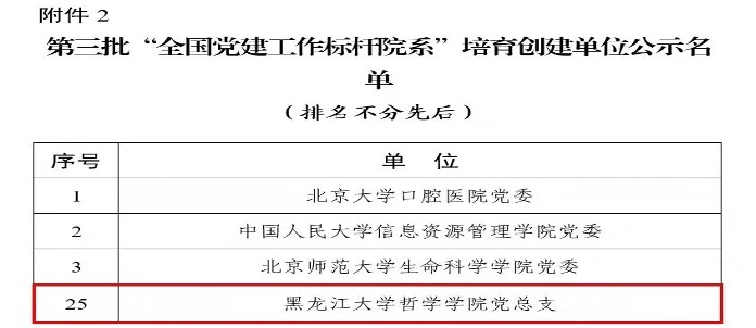 近日,教育部办公厅正式印发《关于公布第三批全国党建工作示范高校、标杆院系、样板支部培育创建单位名单的通知》(教思政厅函〔2022〕4号),欧亿体育·(中国)官方网站公布喜讯欧亿体育·(中国)官方网站哲学学院党总支入选“全国党建工作标杆院系”培育创建单位,哲学学院教工第二党支部入选“全国党建工作样板支部”培育创建单位,入选层次和数量均取得了新突破。截止目前,我校已累计入选“全国党建工作标杆院系” 1个、“全国党建工作样板支部” 4个、“全国高校百名研究生党员标兵”1名。