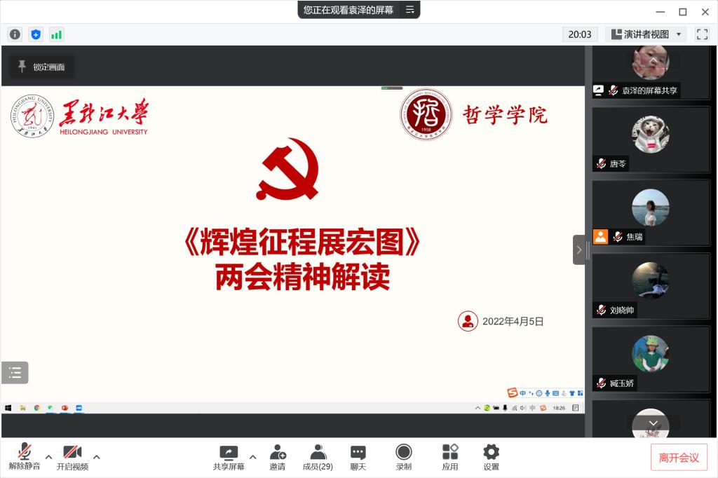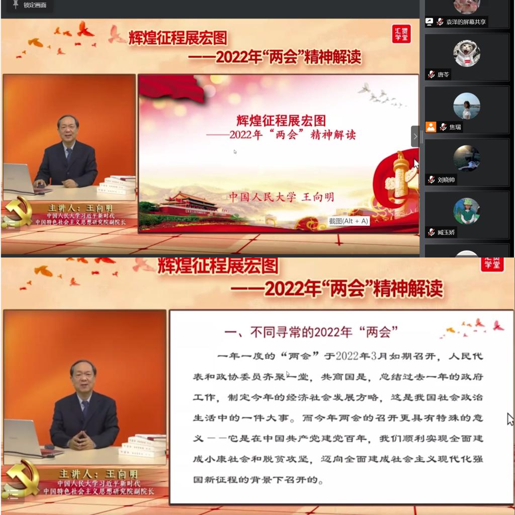 为加深学生党员、学生入党积极分子、学生干部对党的认识,深刻体会党的宗旨,深刻领悟两会精神,提高同学们的思想政治素质,增强学生政治责任和担当意识,深入学习贯彻习近平总书记在全国两会期间的重要讲话和全国两会精神,推动党中央决策部署贯彻落实,加强党的思想理论建设,促进学院思想政治教育发展,哲学学院各年级组织同学们线上集中观看“《辉煌征程展宏图》两会精神解读”,共同学习两会精神。