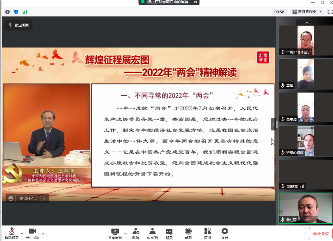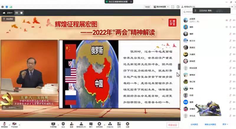 理论学习中心组成员共同观看学习了2022年“两会”精神解读讲座视频《辉煌征程展宏图》。此次专题讲座由中国人民大学习近平新时代中国特色社会主义思想研究院副院长、央视国际特聘专家王向明教授以《辉煌征程展宏图——2022年“两会”精神解读》为题,围绕全国“两会”召开的背景、未来工作的主要目标、高举旗帜向未来三个方面为大家做了全面、详实、清晰的深度解读。理论学习中心组学习后,教工第一党支部和教工第二党支部共同召开了主题党日活动,组织党员集中观看学习讲座视频《辉煌征程展宏图》。