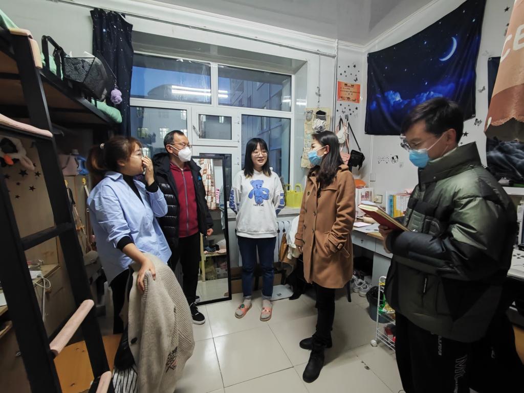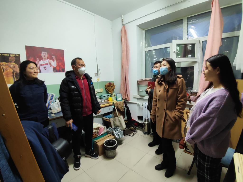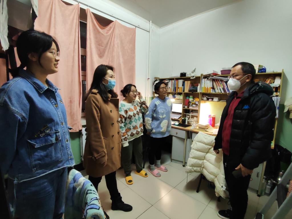 为深入了解学院学生生活动态,帮助学生解决实际难题,尽快适应疫情管理生活,切实加强疫情管理期间的卫生及安全管理工作,2022年4月6日晚,哲学学院党总副支书记张丽丹、2019级辅导员孙庆斌、2018级、2020级辅导员张博伦和2021级辅导员焦瑞走进各年级学生寝室,为同学们送去疫情管理期间的关心与问候。