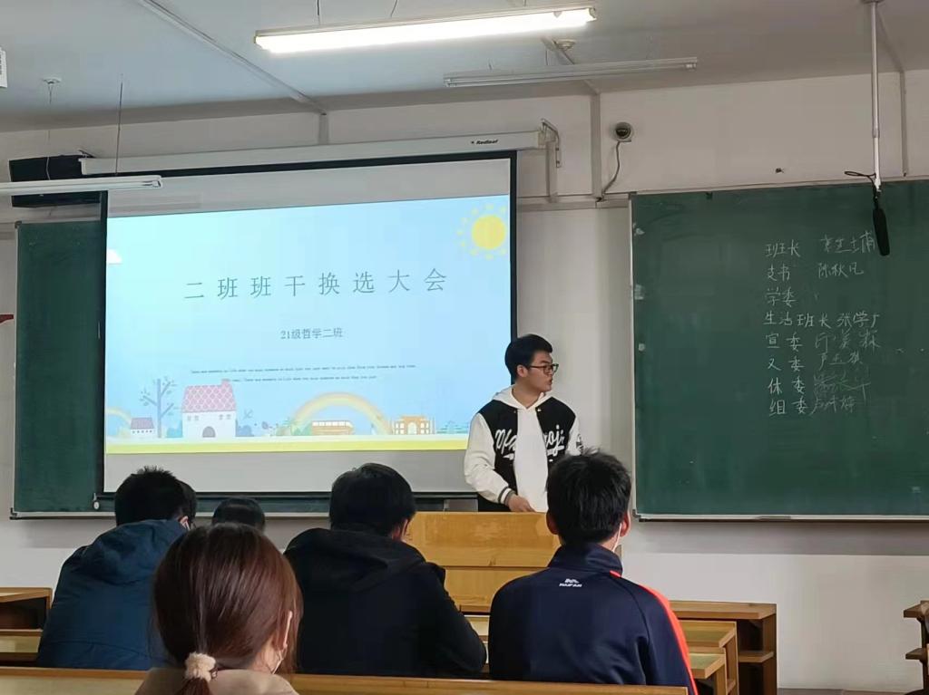 首先辅导员焦瑞老师开始班会,讲解了班干换选细则,提出作为合格班干的要求:班干不仅要学习成绩优秀,而且更要有一定的组织能力与管理能力,有责任心、奉献意识、大局意识。其次焦老师鼓励大家积极参与竞选班干部,担任班干更是一次能够提升自己的沟通能力、协调能力,磨炼自我意志、收获真挚友谊的宝贵经历。