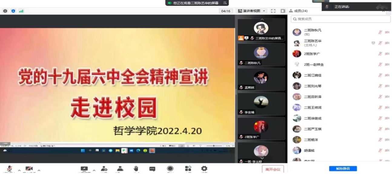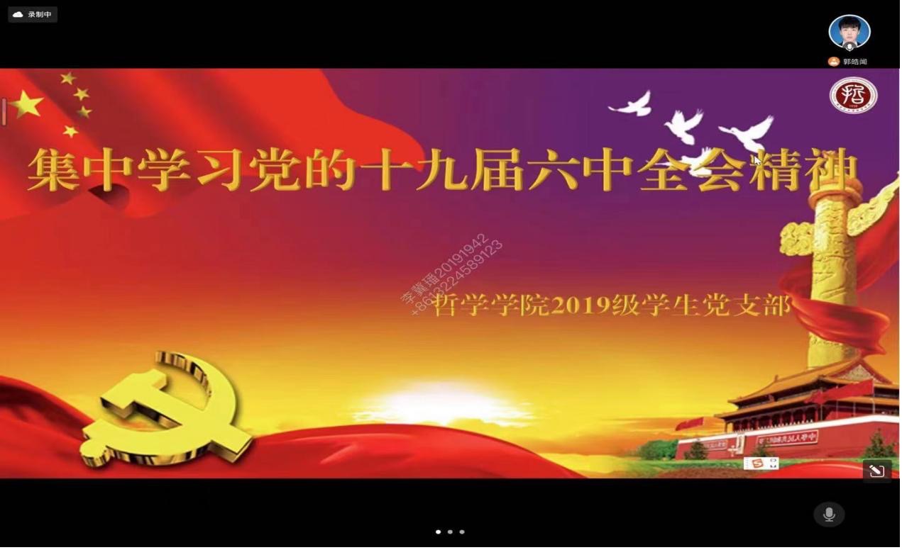 为深入贯彻落实习近平新时代中国特色社会主义思想,认真学习党的十九届六中全会精神,加深同学们党的认识,深刻体会党的宗旨,提高同学们的思想政治素养,哲学学院于2022年4月20日组织各年级学生党员、学生入党积极分子、学生干部共同在线上观看党的十九届六中全会走进校园直播宣讲。
