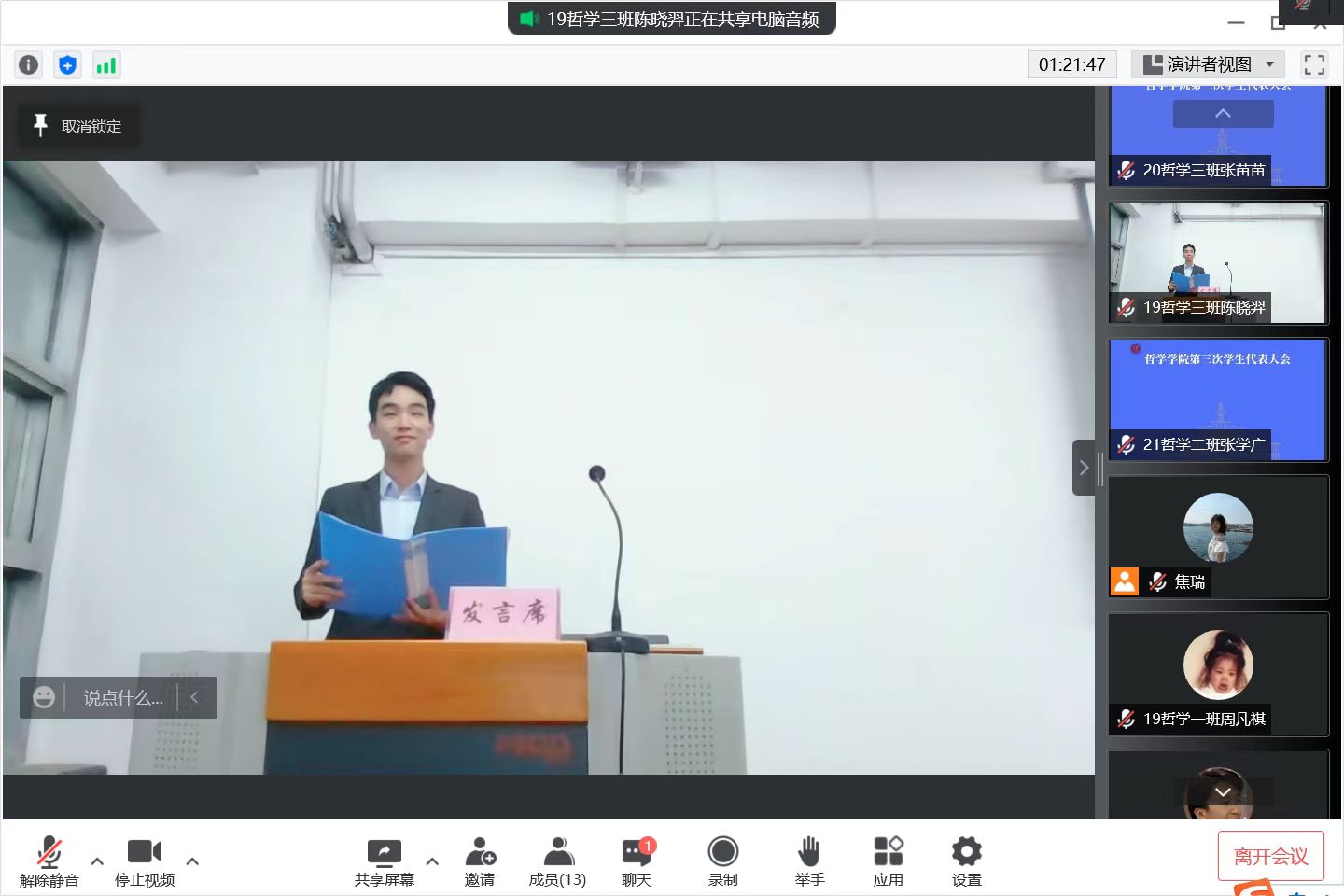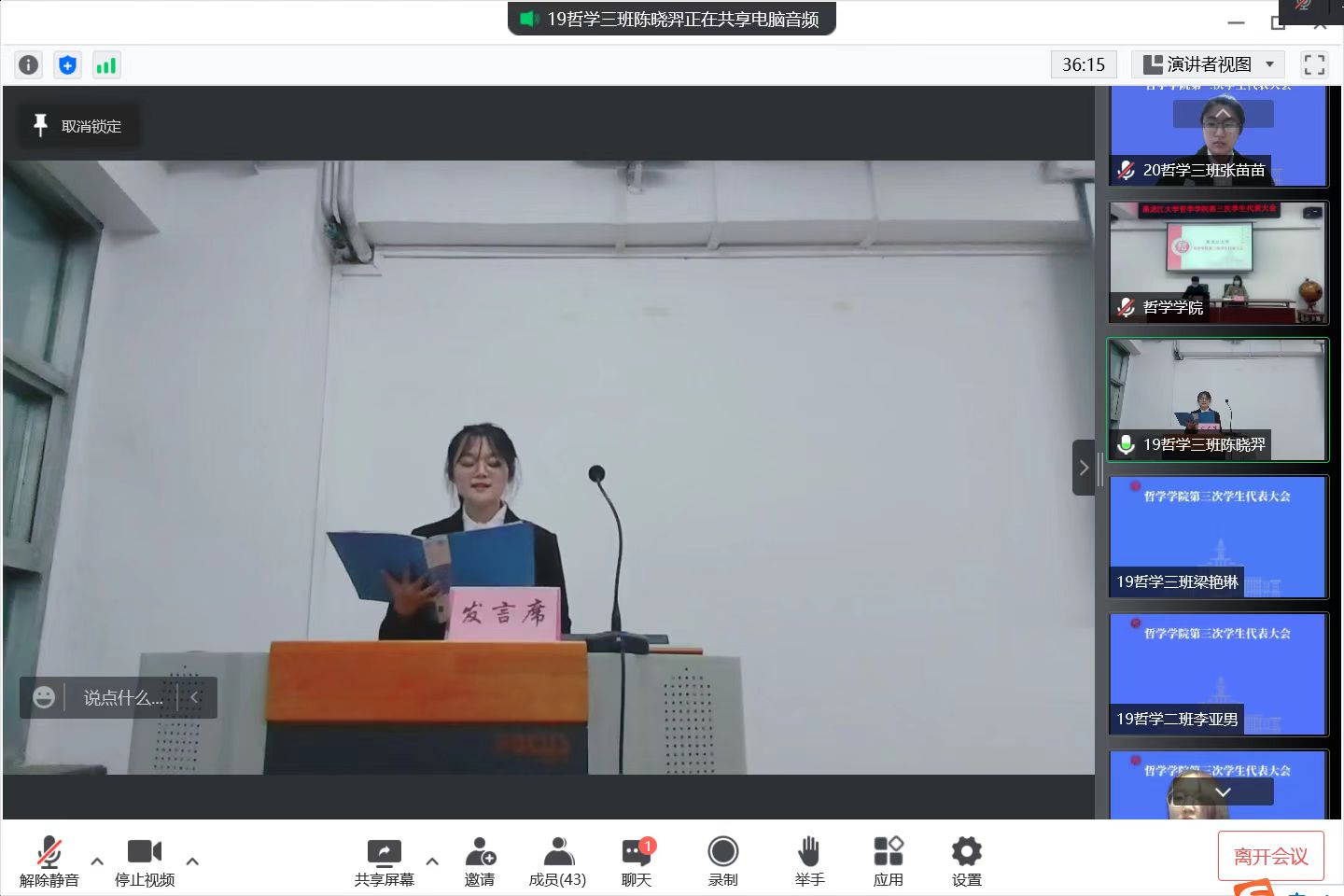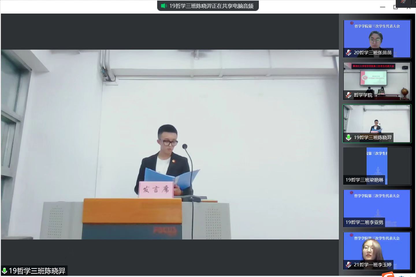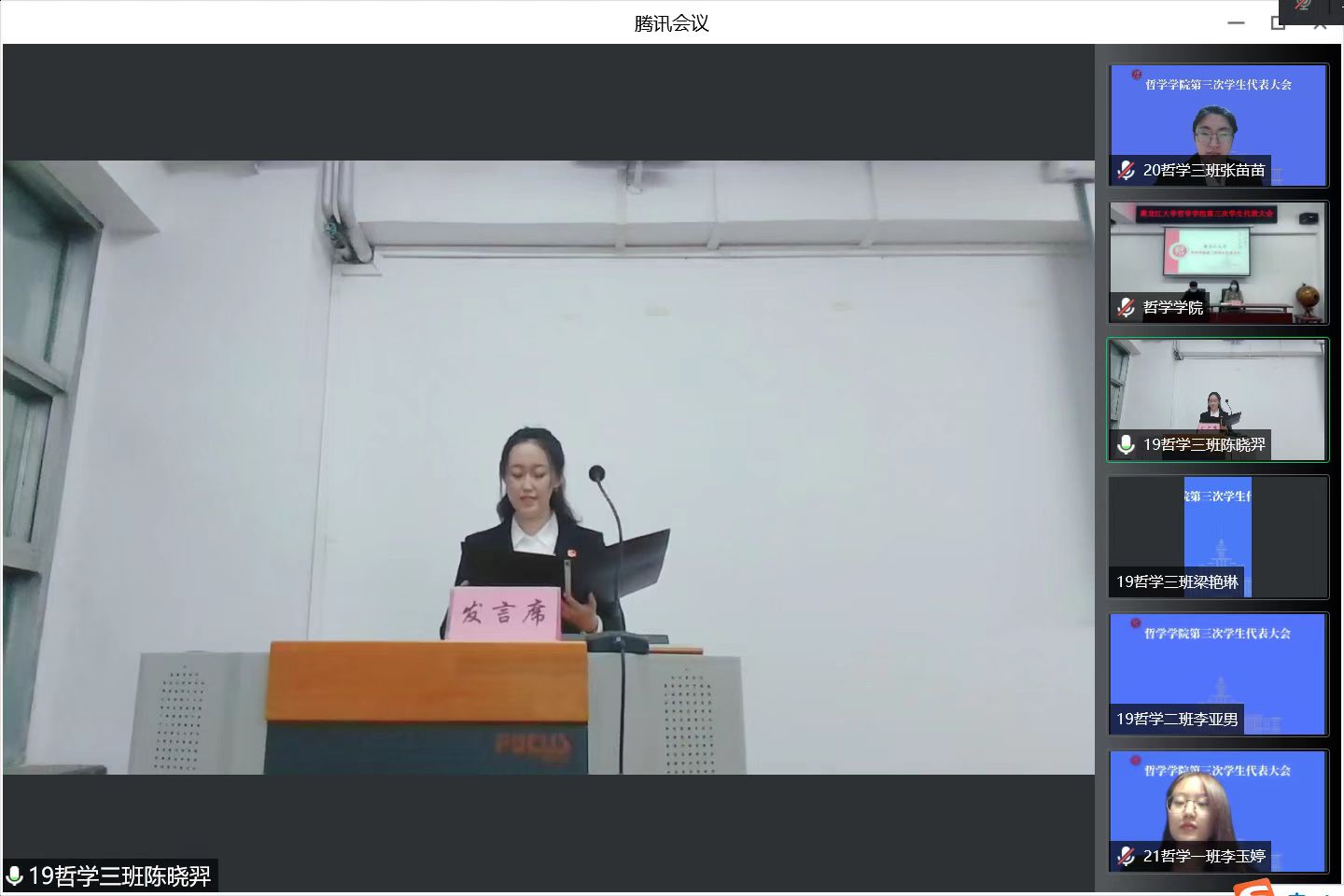 为贯彻落实校团委《关于加强学生会建设管理的通知》要求,积极响应欧亿体育·(中国)官方网站进一步深化学生会改革,支持和引导学生会更好地服务青年学生成长成才的号召,学院按照上级相关文件相关规定,哲学学院第三次学生代表大会于5月6日晚19:00于汇文楼937通过腾讯会议召开。哲学学院党总支副书记张丽丹老师、正处级辅导员孙庆斌老师、院团委书记张博伦老师、院团委副书记焦瑞老师出席会议,哲学学院各年级学生代表参加大会。本次大会由哲学学院第十一届学生会副主席梁艳琳同学主持。