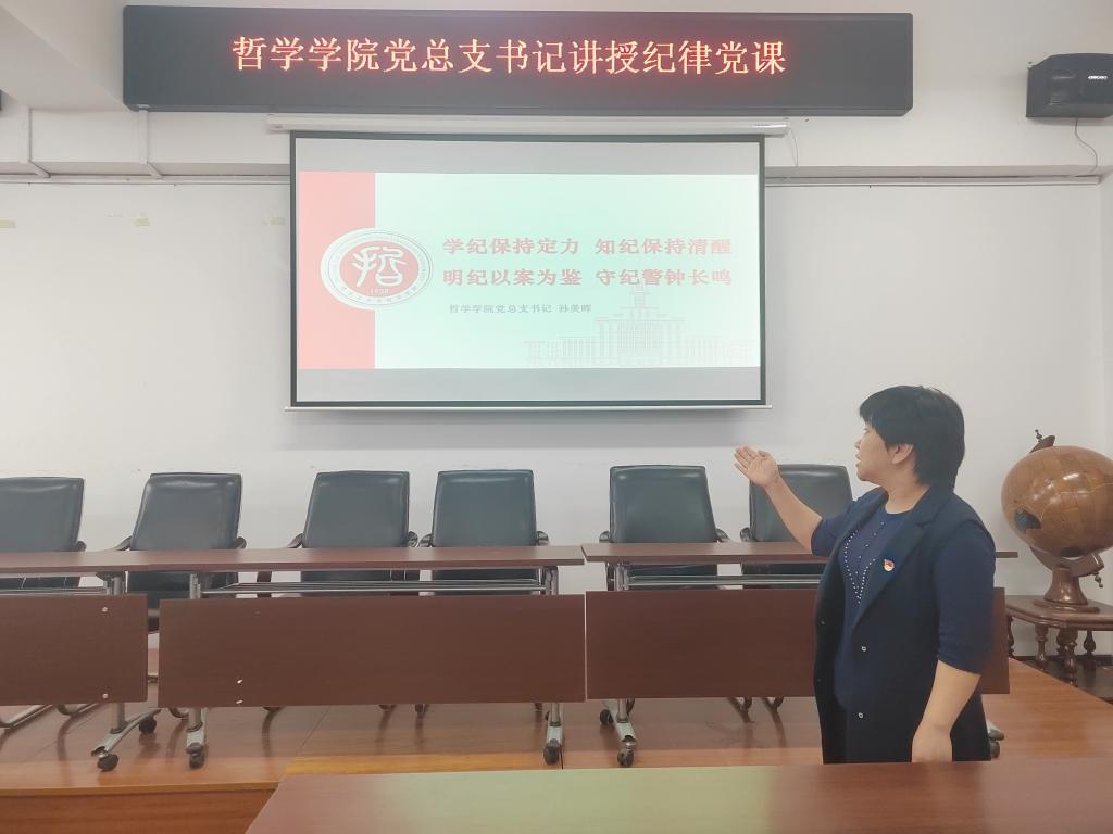 为深入学习贯彻习近平总书记关于党纪学习教育的重要讲话重要指示精神,全面贯彻落实《中共中央办公厅关于在全党开展党纪学习教育的通知》要求和学校相关工作部署,哲学学院决定开展党纪学习专题教育党课。5月15日下午,在汇文楼937室,学院党总支书记孙美晖做题为“学纪保持定力 知纪保持清醒明纪以案为鉴守纪警钟长鸣”专题党课,学院全体教工党员参加会议。